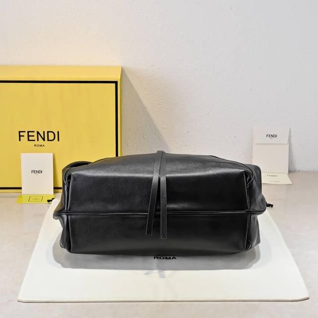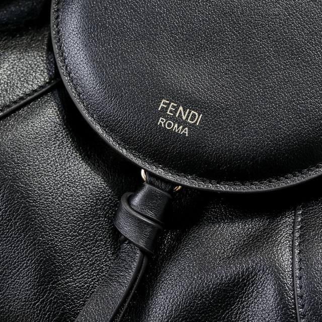 圆形翻盖开合设计暗藏零钱袋,金属饰边设计,配有同色系皮革打结肩带。印有金色Fendi Roma标志。
