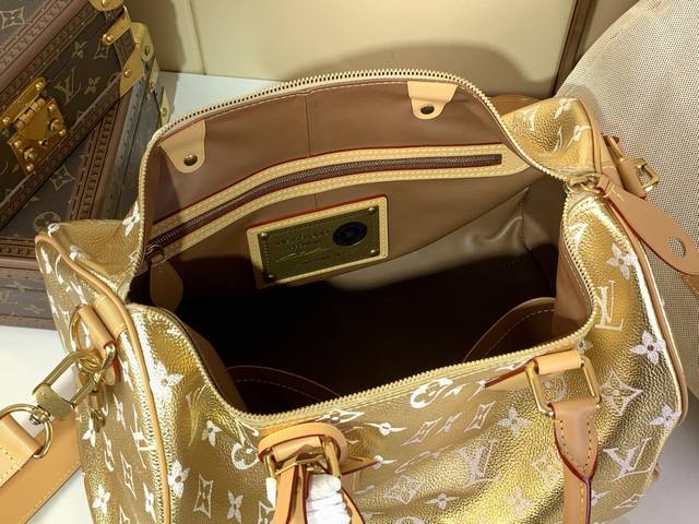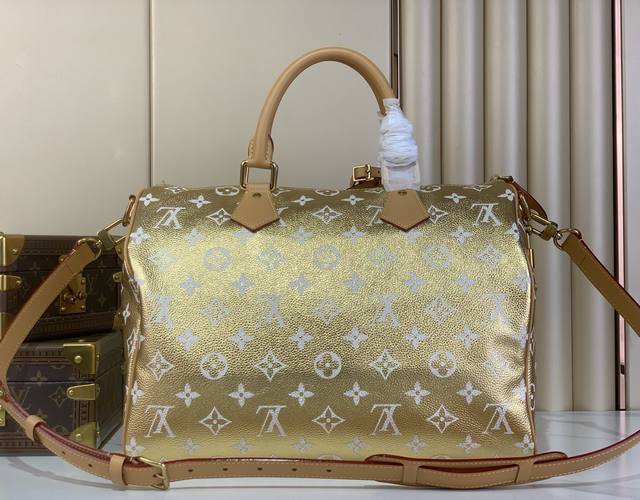 本款Speedy P10 BandoulièRe 40 Monogram Leather手袋为柔软粒面牛皮革包裹羊皮革内衬,以丝印Monogram 图案呈现帆布印花的迷离观感,道出创意总监Pharrell Williams的新季巧思。