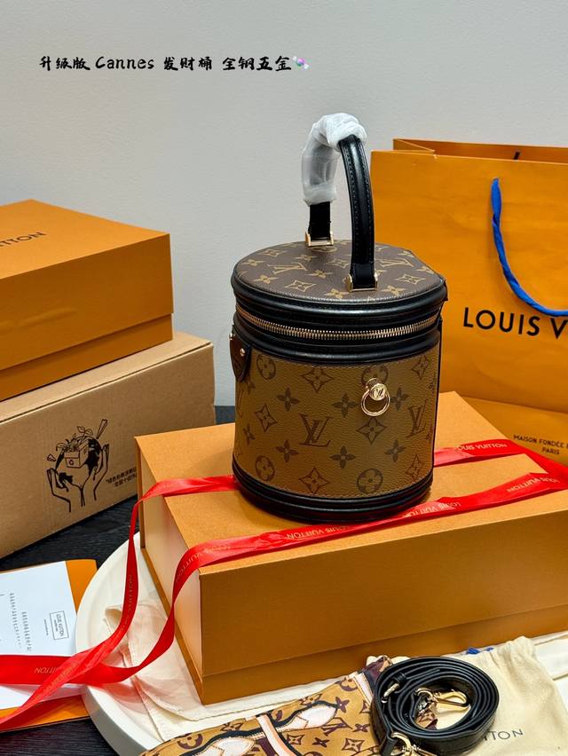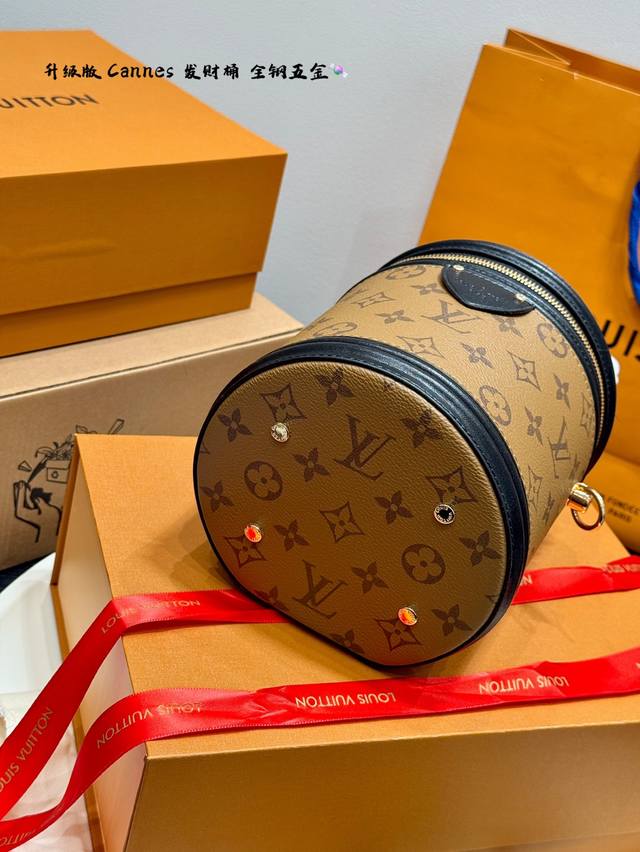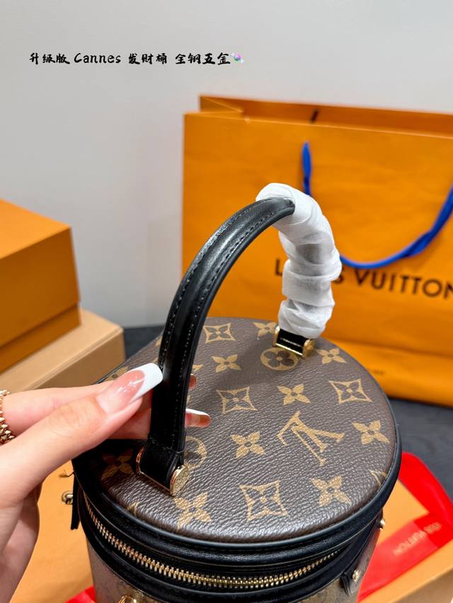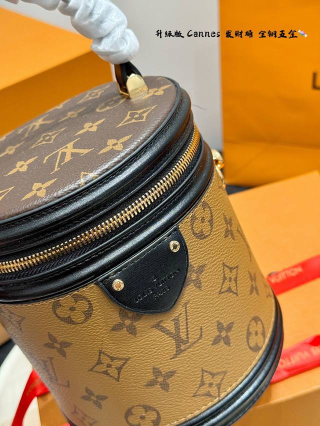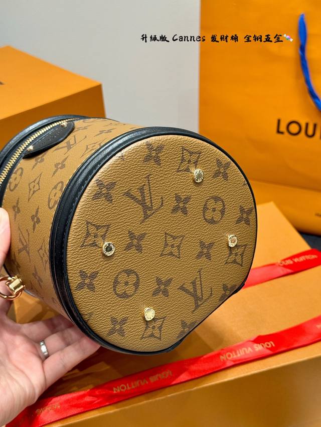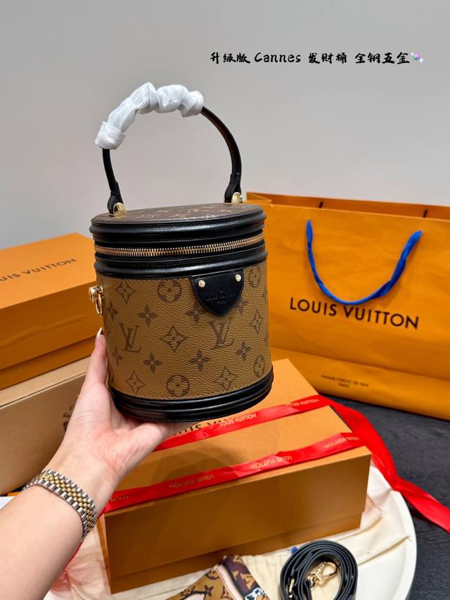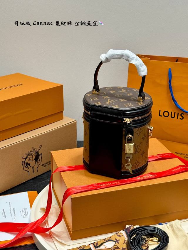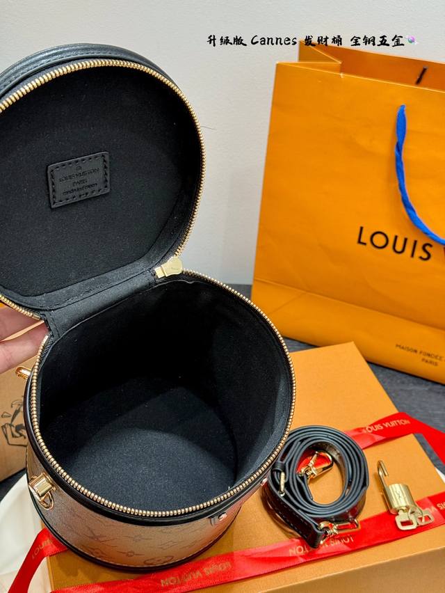 全套礼盒 升级版!全钢五金!带芯片 Size:17.15Cm Lv Cannes 饭桶水桶包 发财桶!发财桶! 越用越香!!! 百搭实用 黑色真皮 原版帆布涂层