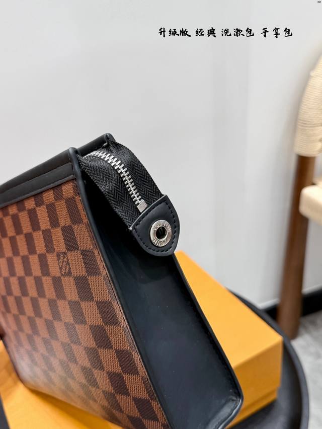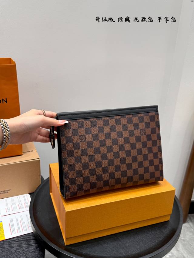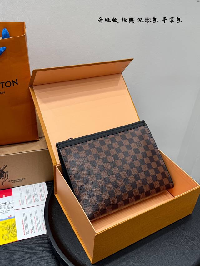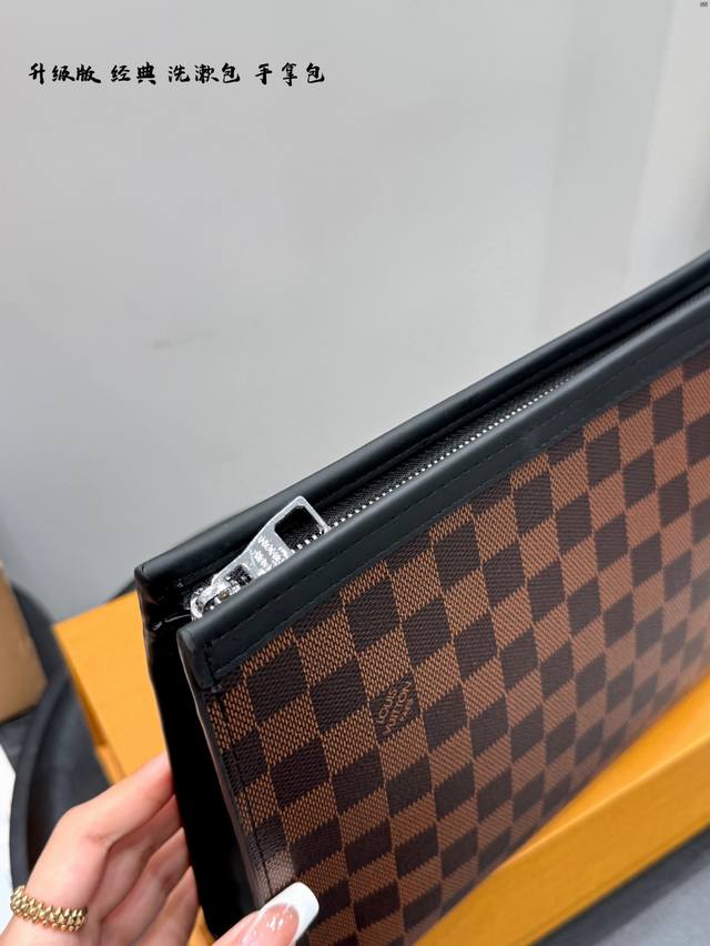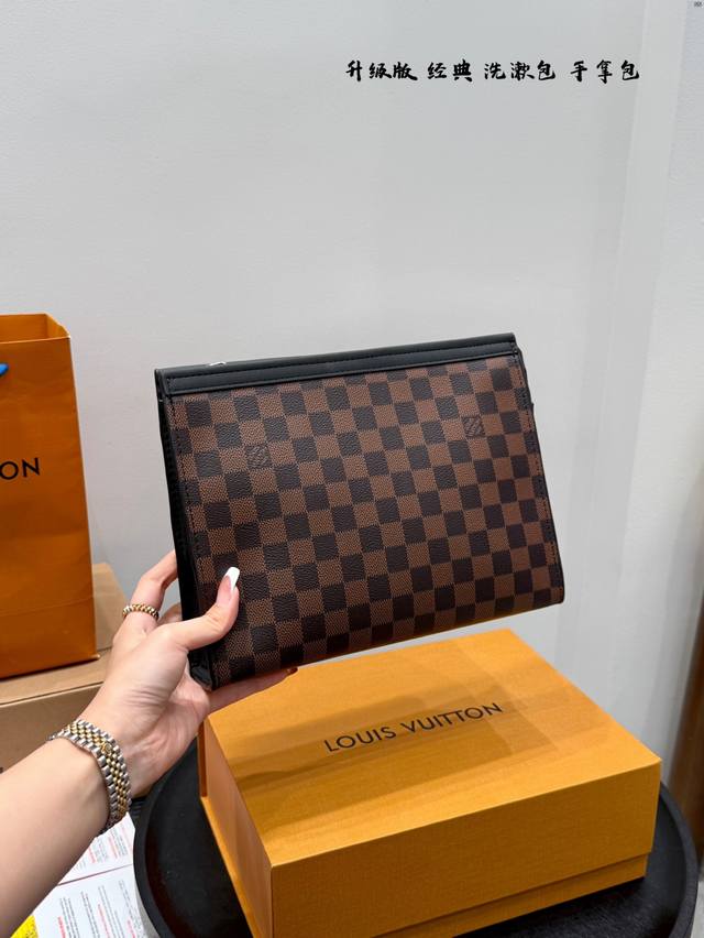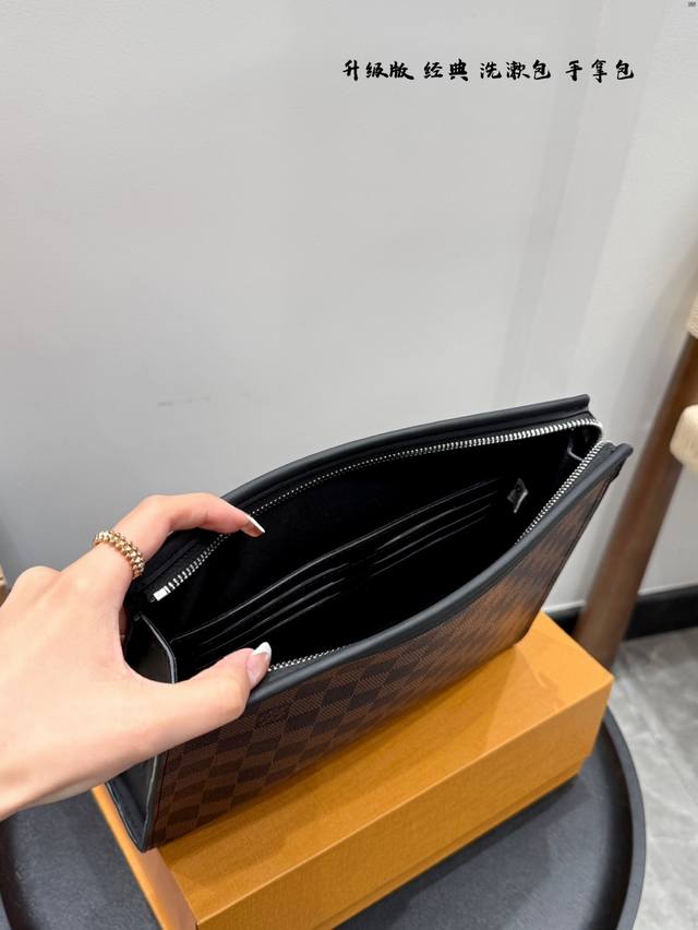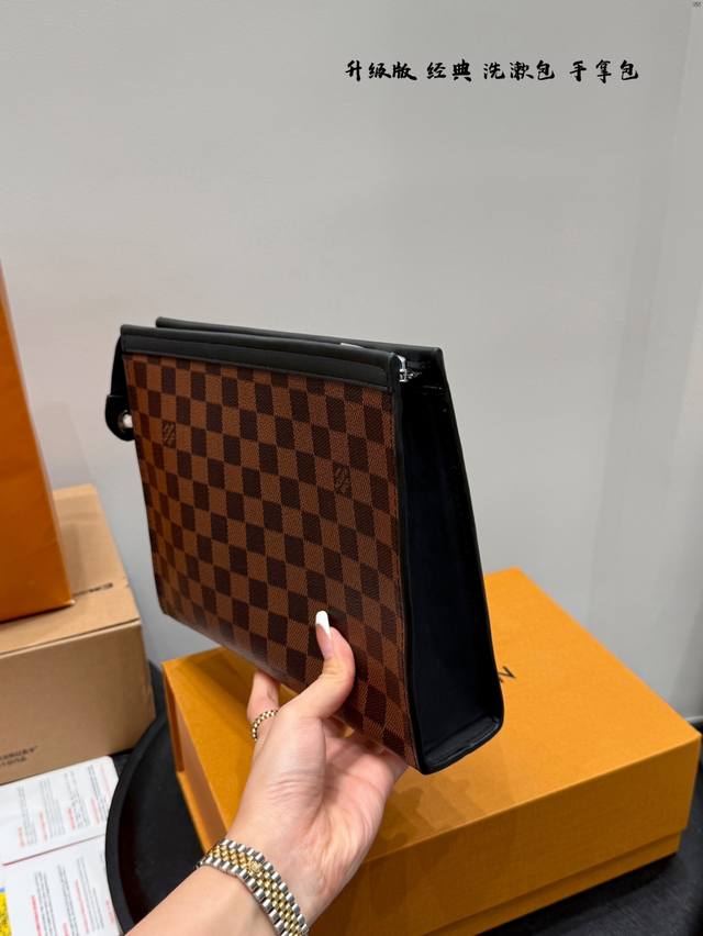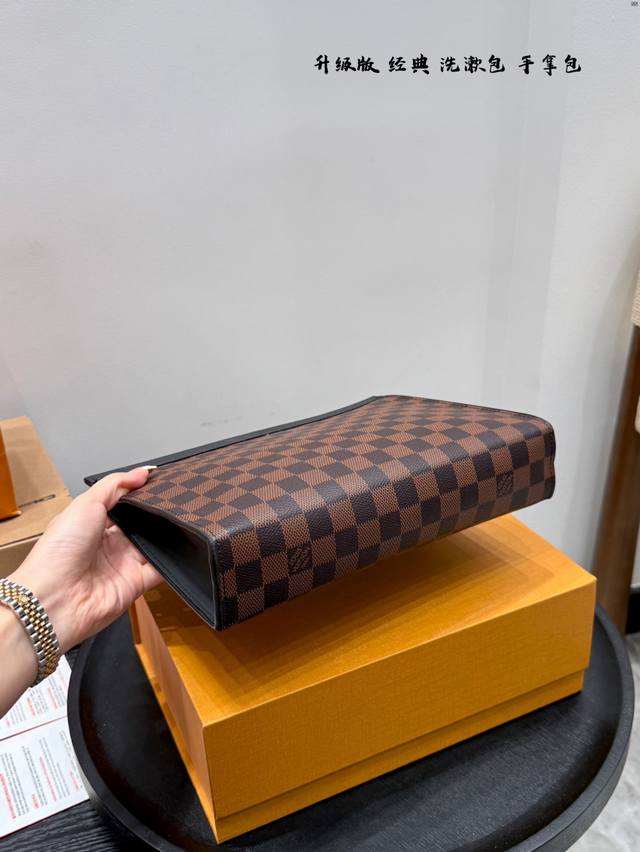 配礼盒 Lv经典款洗漱包 男士手拿包新品 多用款 其实包包本身是个洗漱袋化妆包 被拿来用做手包 一般的手包都是扁扁的 但是这款手包底部是宽的 虽说是个手包 但能