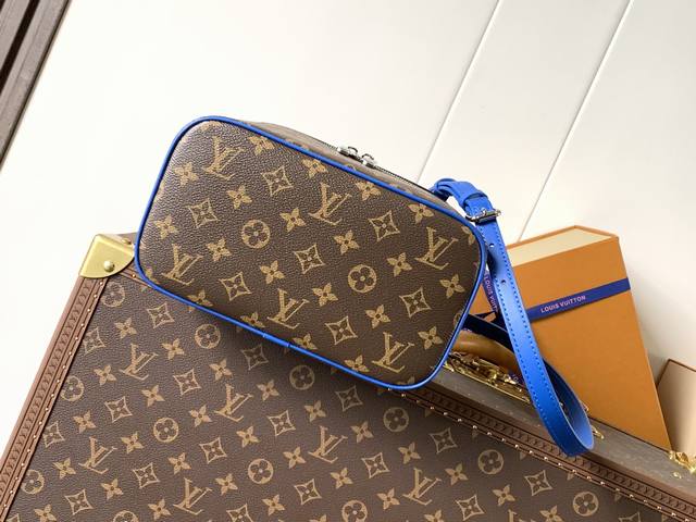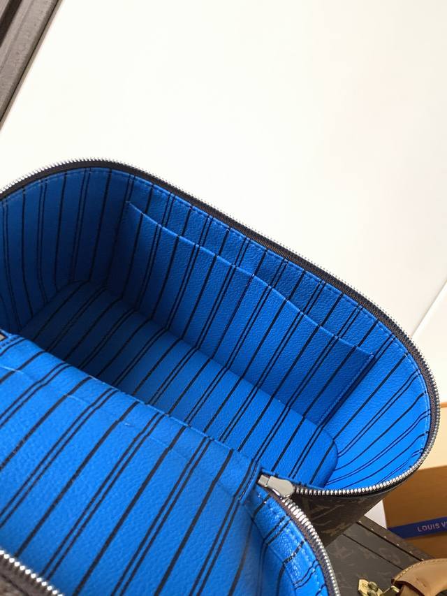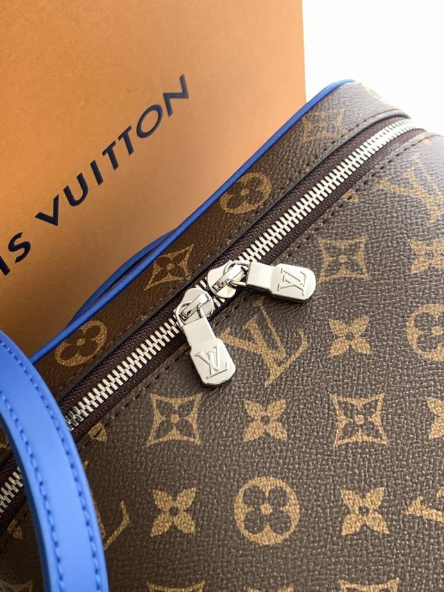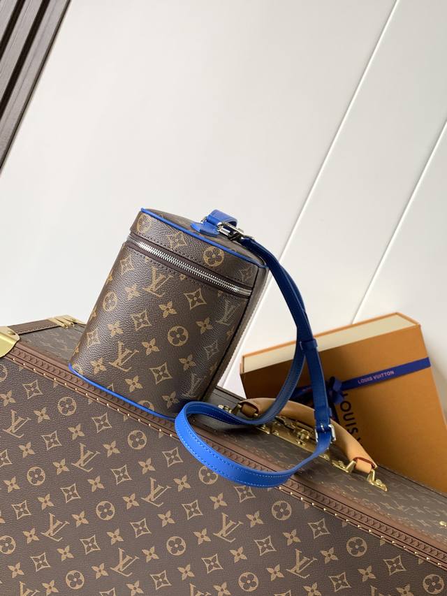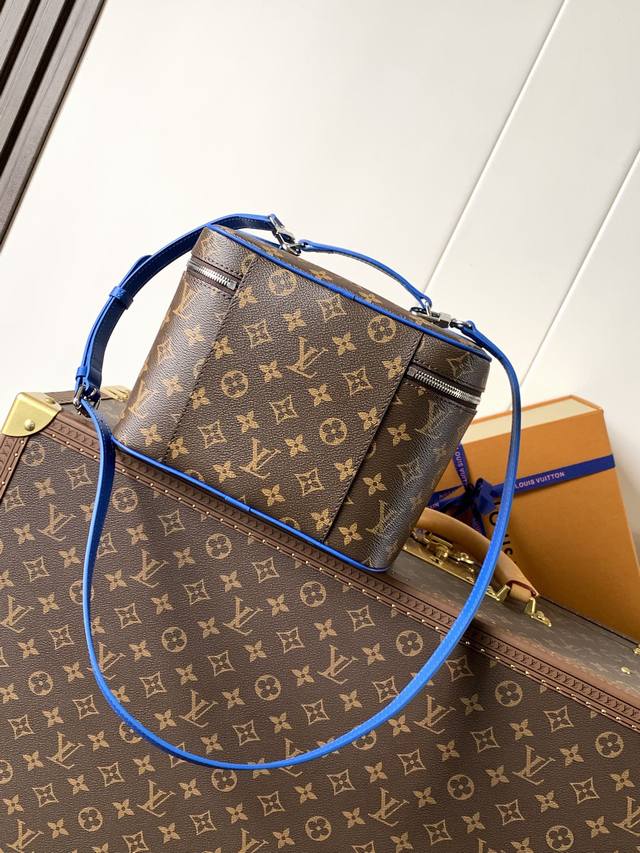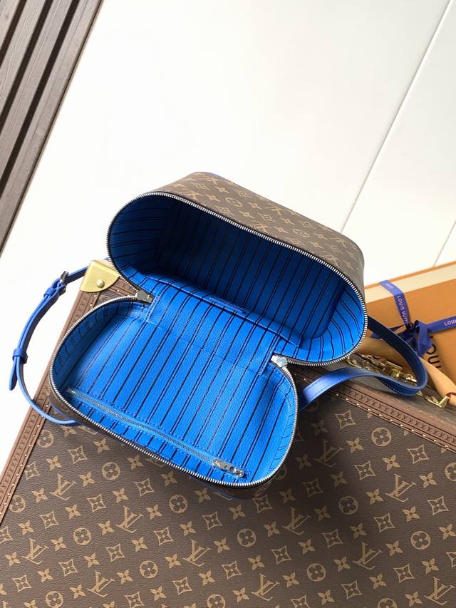 本款 Nice Bb 化妆包取材经典 Monogram 帆布,为镶边、顶部手柄和可水洗内衬渲染亮丽色彩,灵感源自品牌初代硬箱的丝带装饰。内里和顶部翻盖分别设有贴袋和隐藏式拉链袋。
