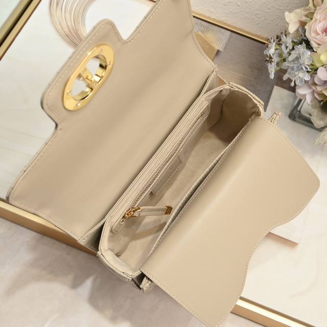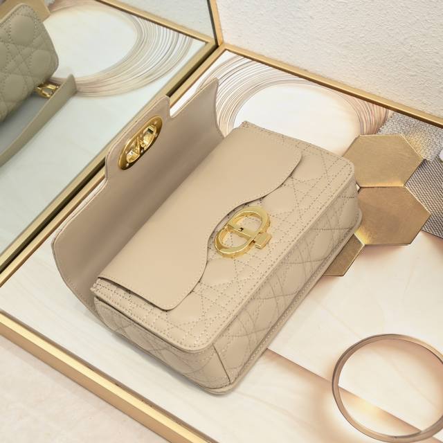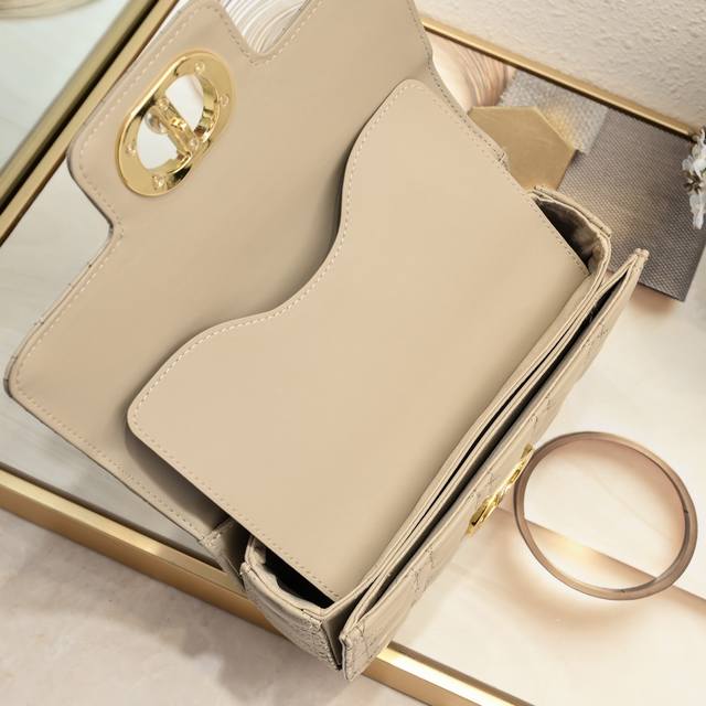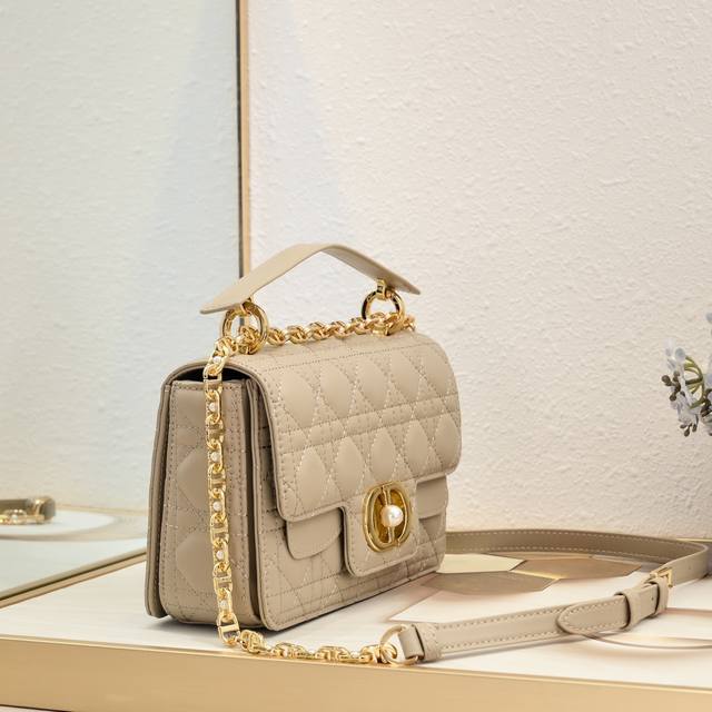 这款Dior Jolie 手提包是二零二四春夏成衣系列新品,兼具优雅气质与实用功能。采用白色牛皮革精心制作,饰以藤格纹缉面线,双重翻盖饰以Cd 标志提升格调,点缀以白色树脂珠饰,三隔层和拉链口袋可收纳各种日常用品,可与日常或晚装造型搭配。小号款式,搭配可拆卸手柄与可拆卸链条肩带,肩带由皮革带和 Cd 标志链环组成,饰以白色树脂珠饰,可舒适手提[6]