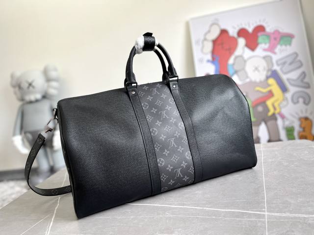 顶级 !M30235 黑色 Keepall 50旅行袋 配肩带 质地柔软、风格优雅的原创Keepall旅行袋,十字纹配花料旅行袋标志性Taiga皮革材质,时尚而实用的周末休闲伴侣。 Size:50*29*23