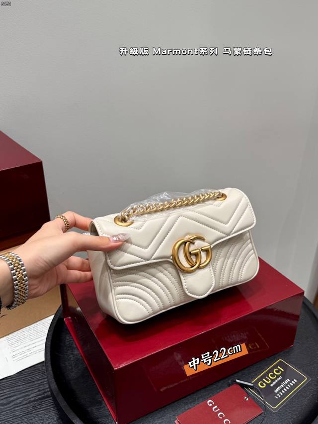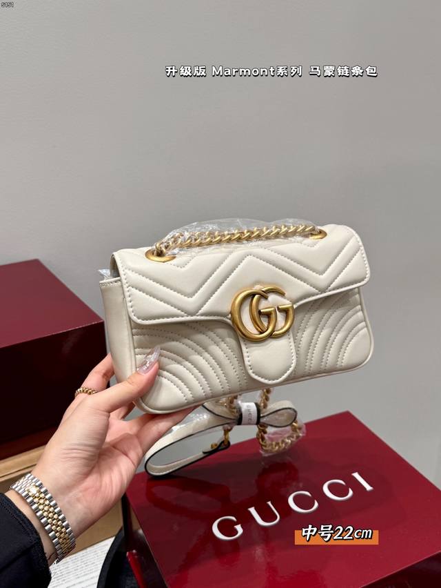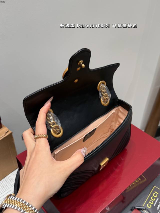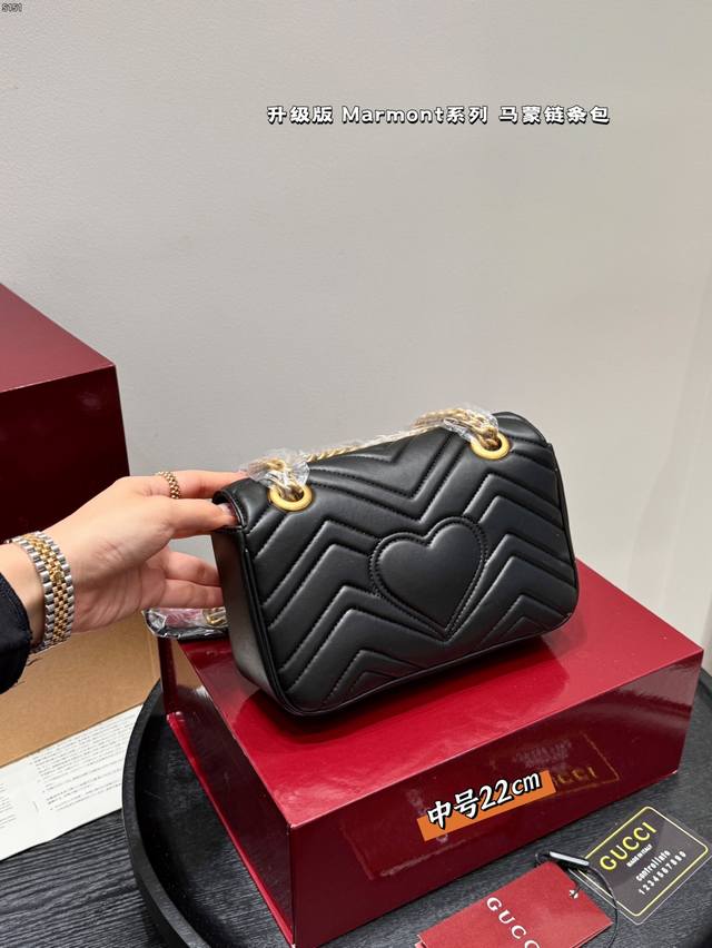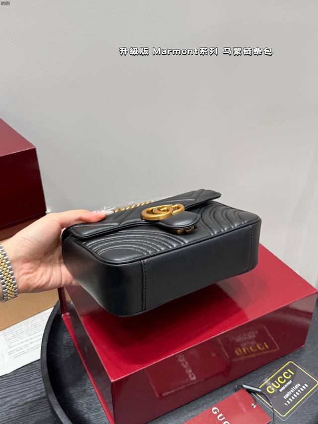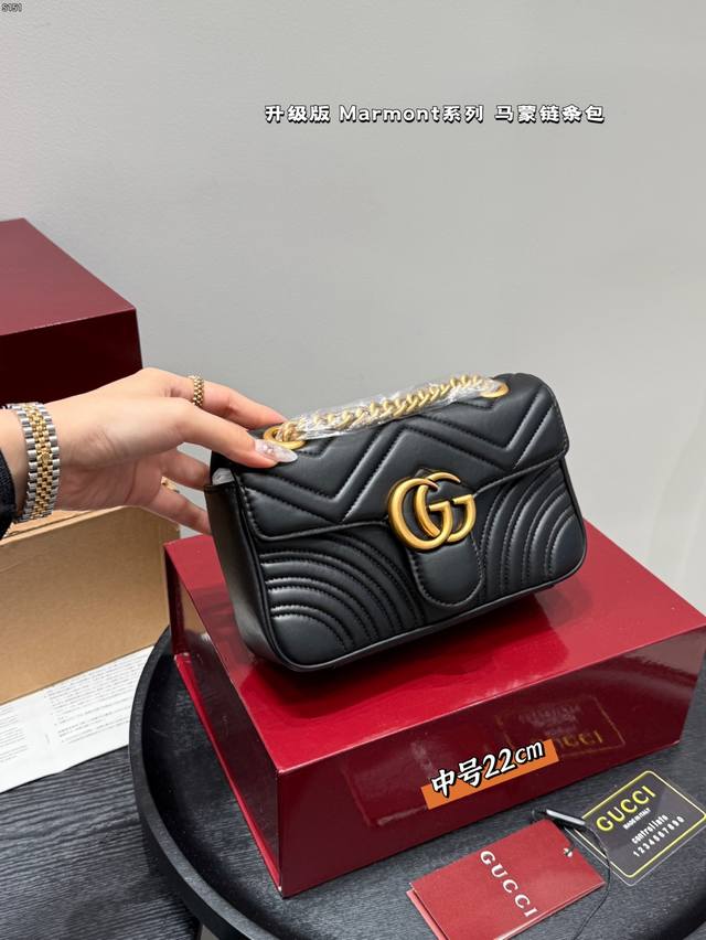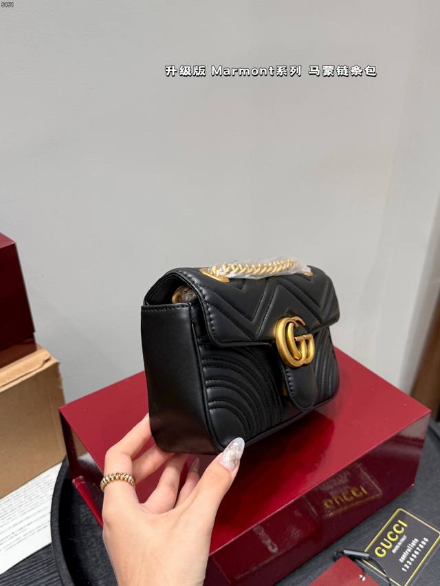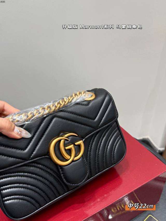 Gucci Marmont 马蒙链条包 系列链带肩背包采用颇具结构感的柔软造型和超大号翻盖封口,配以双 G 金属配件。可滑动链条肩带有多种背法,可在肩背和手提之间自由转换。采用波浪纹绗缝皮革,背面配以 Gg 标志专柜热销爆款