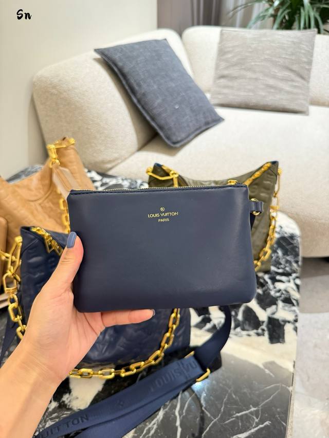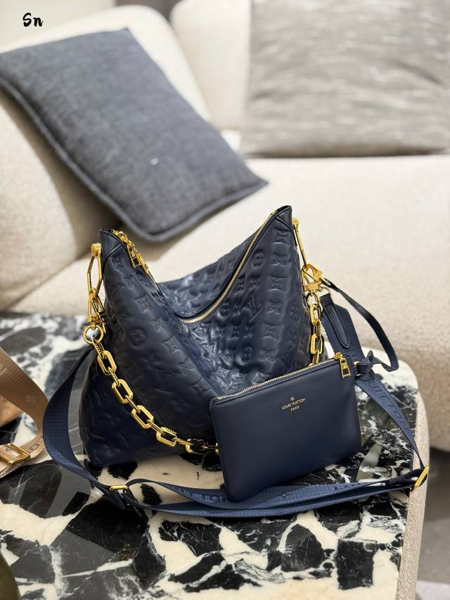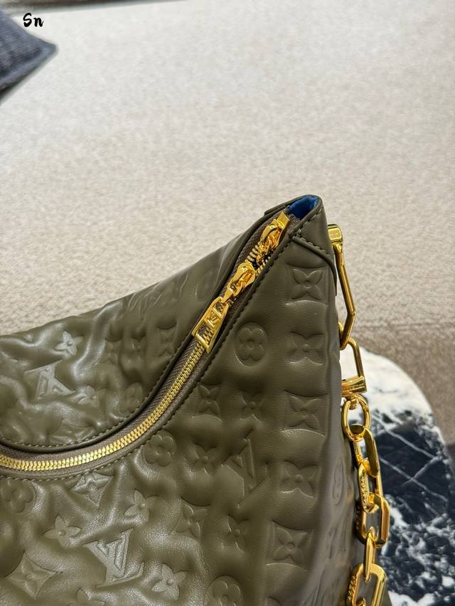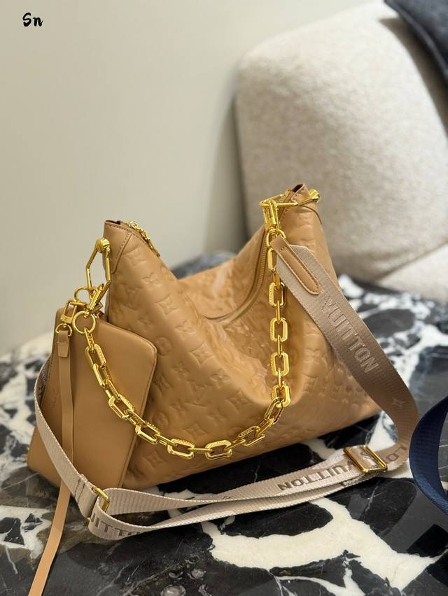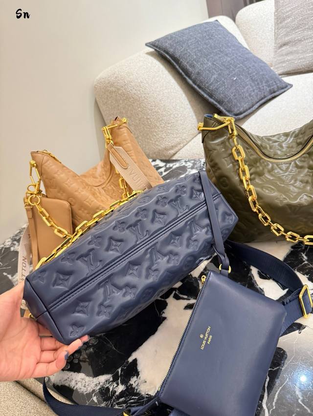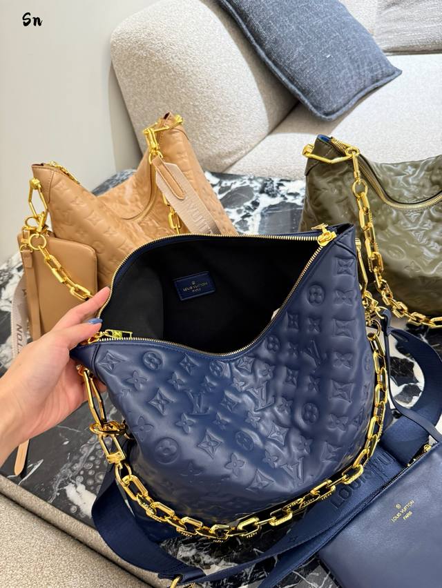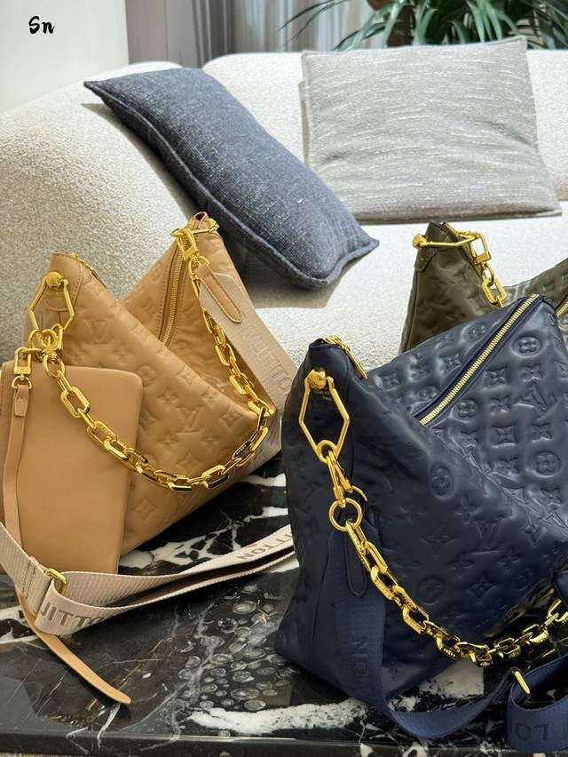 升级原版 M12068 M12071 M12072 這款全新Coussin系列的流浪包兼具時尚與功能,並糅合了系列標誌性的設計元素。手袋採用滑面的鋪棉皮革製造,並綴以品牌的Monogram壓花圖案。標誌性的粗鏈帶搭配金色金屬件,而可拆式紡織寬肩帶則可作不同的方式攜帶。這個百搭款式足以容納手提電腦,並設有可拆式拉鏈口袋。尺寸:38X33X10厘米