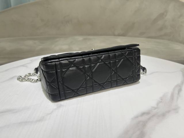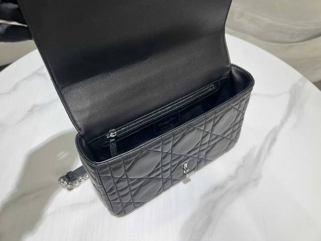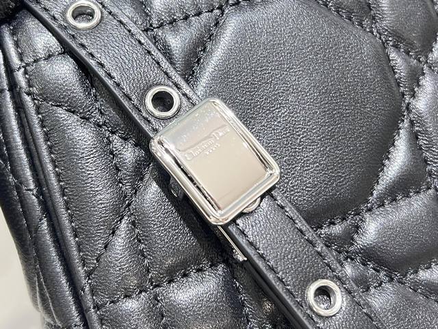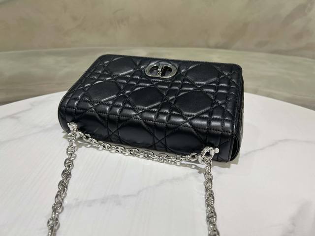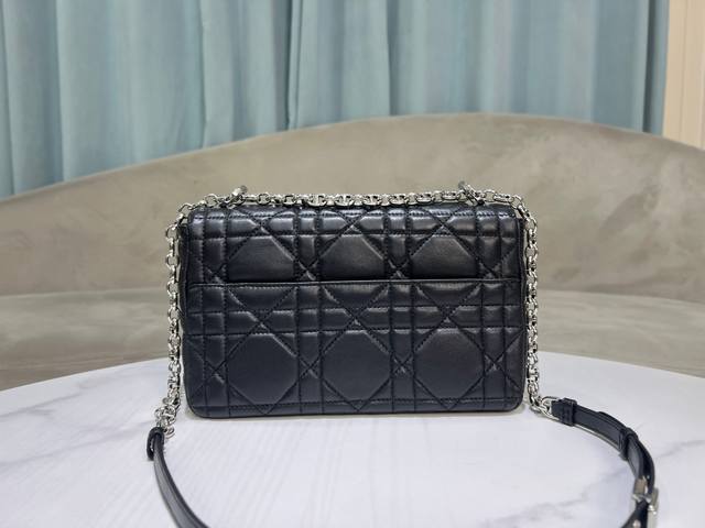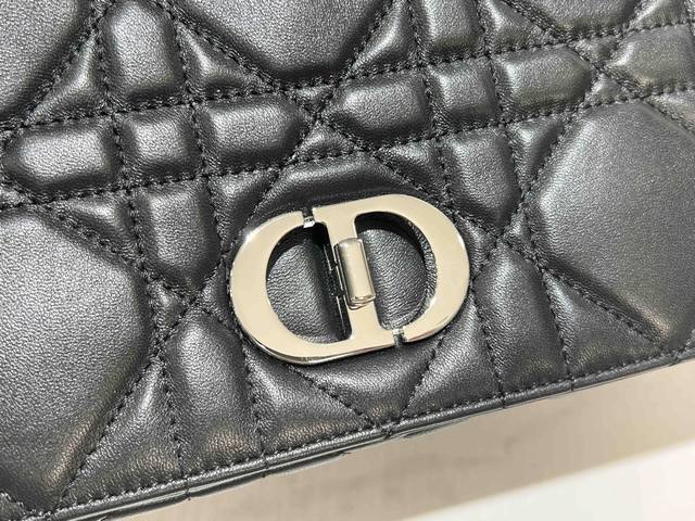 这款Soft Dior Caro 手袋是二零二五秋季成衣系列新品,柔软廓形融合时尚气质与典雅魅力。采用奢华黑色羊皮革精心制作,饰以超大藤格纹缉面线,翻盖饰以复古金色饰面金属旋钮式Cd扣环,灵感源自Christian Dior 香水瓶的封口。小号款式,搭配可拆卸的 Cd 链环肩带,可手提、肩背或斜挎,亦可替换成刺绣宽肩带,点缀日装或晚装型