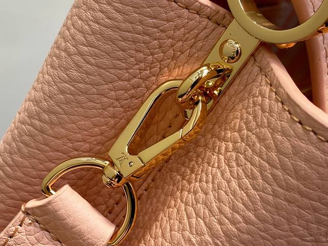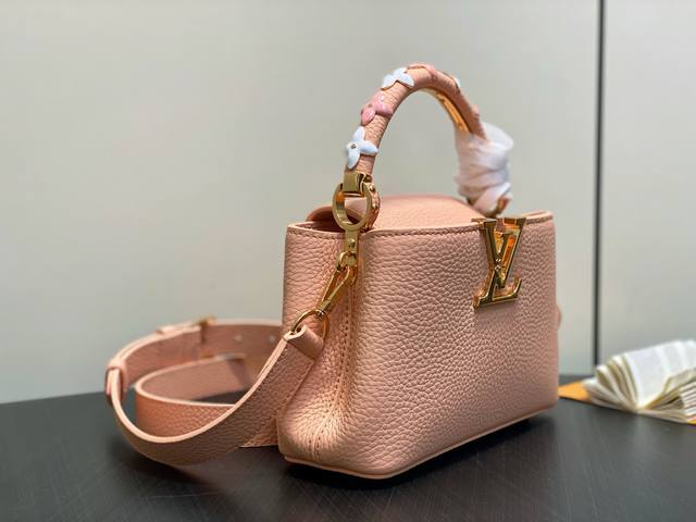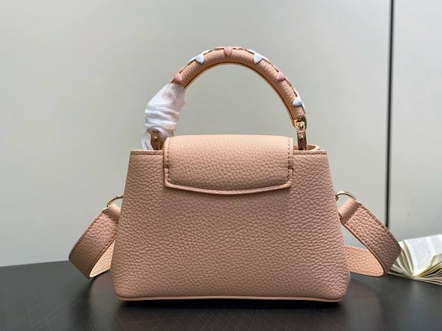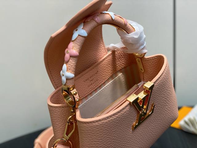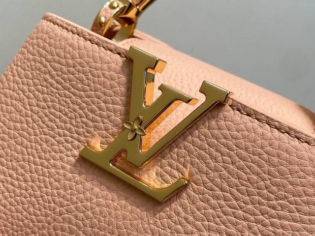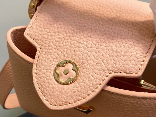原单精品 M14976裸色 四叶草全皮Cap那英款 本款Capucines 迷你手袋 于手柄融入精致Monogram花卉,以细腻笔触呈现Lv标识的立体观感,为柔美设计注入夺目光彩。全粒面Taurillon皮革塑造玲珑构型,可容纳智能手机、短款钱夹和其他随行小物。尺寸:21 × 14 × 8 Cm。