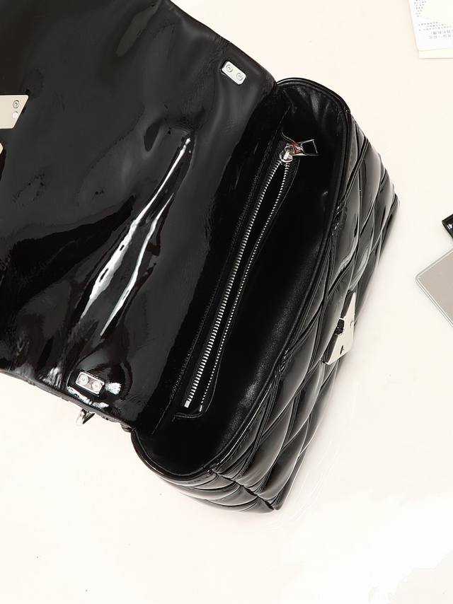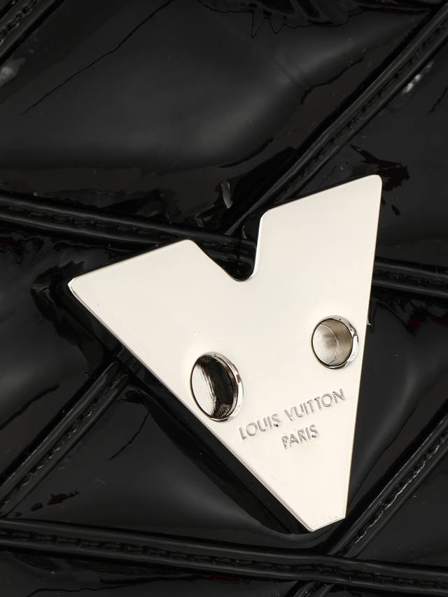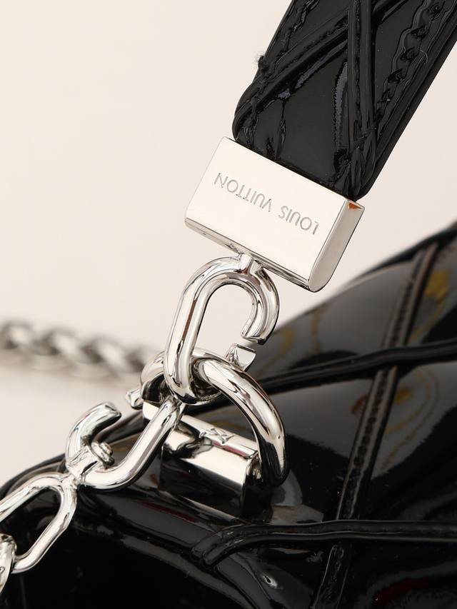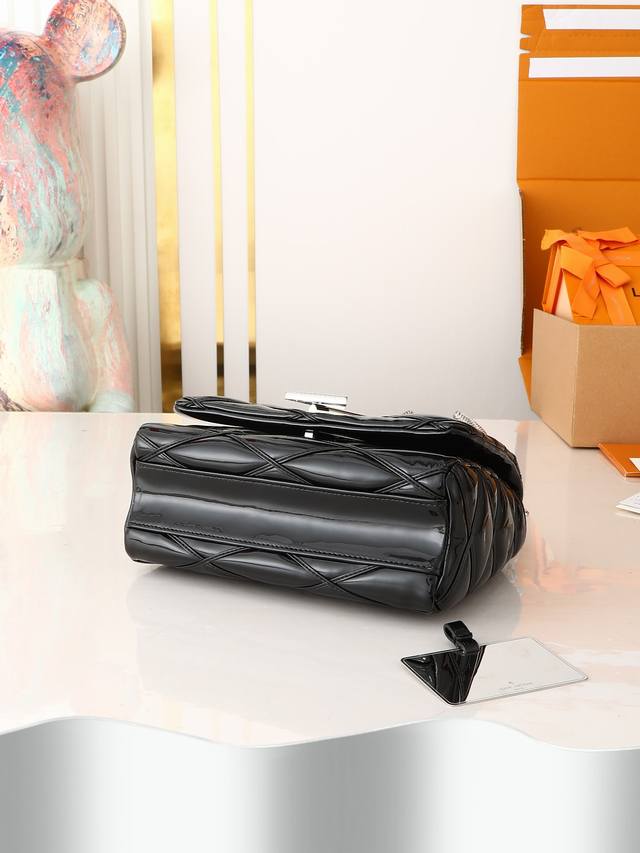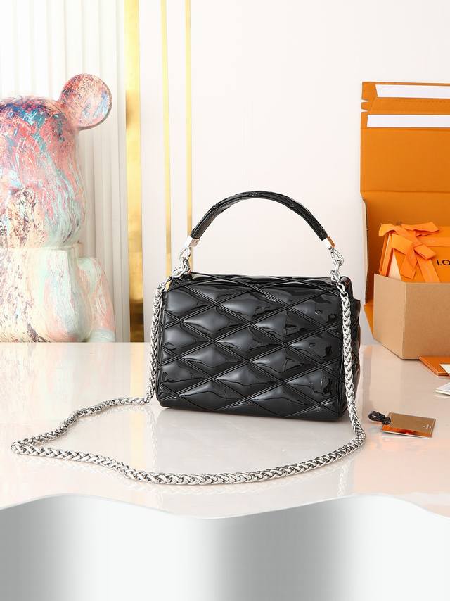 出厂价p 顶级原单 独家实拍 M25046 22891黑色漆皮 全皮菱格链条包系列 Go-14 Teist 中号手袋 M23045 M22890 本款 Go-14 中号手袋取材华美羊皮革,以绗缝图案致敬品牌传统行李箱设计。Lv Twist 扭锁彰显瞩目风范,顶部手柄可单独手提,亦可化为滑链肩带的皮革肩垫,实现舒适肩背或斜挎体验。尺寸:23 X 16 X 10 厘米。