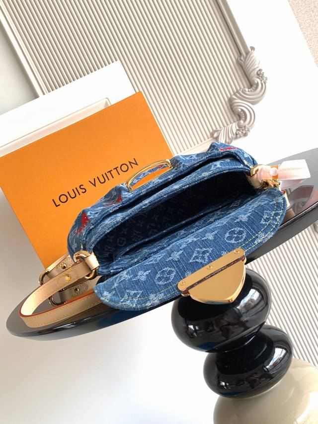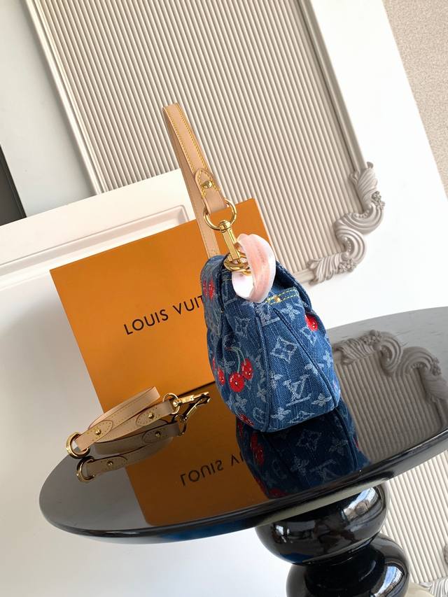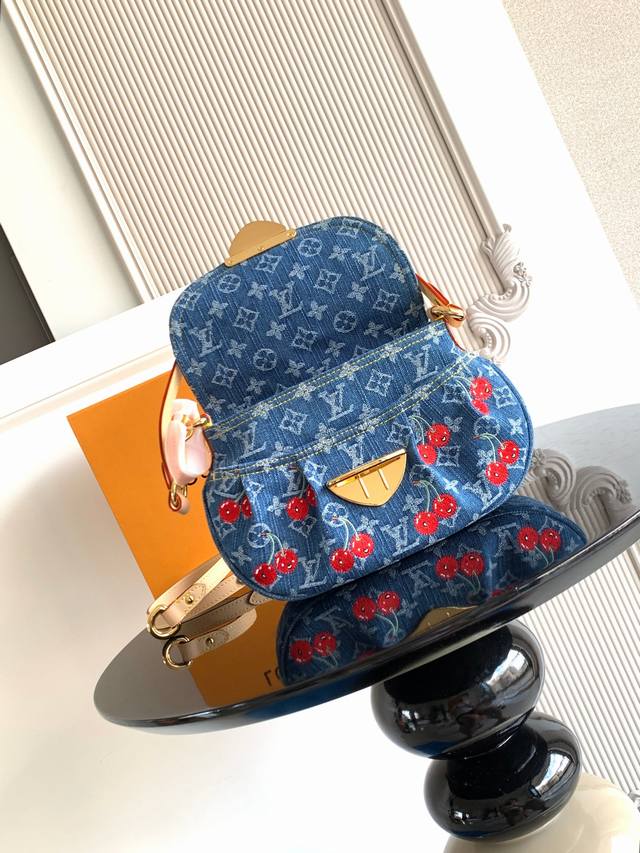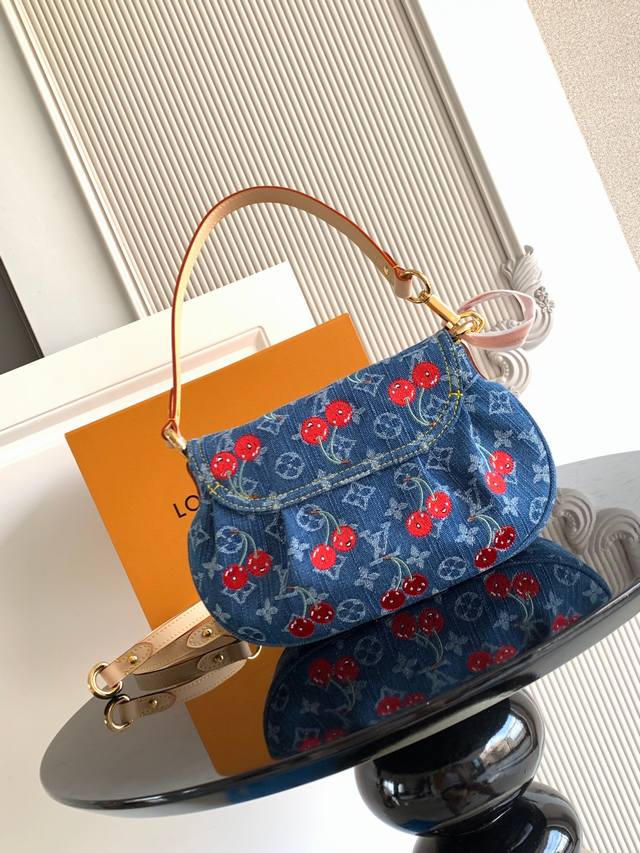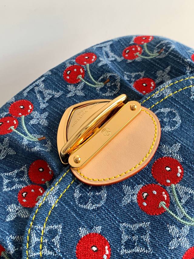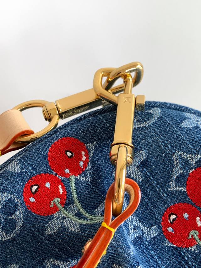 本款 手袋取材 丹宁布,以复古笔触塑造圆润构型,再借醒目插扣点亮设计。明丽樱桃刺绣彰显路易威登 村上隆复刻系列的灵动格调,饰钉皮革肩带完善整体。