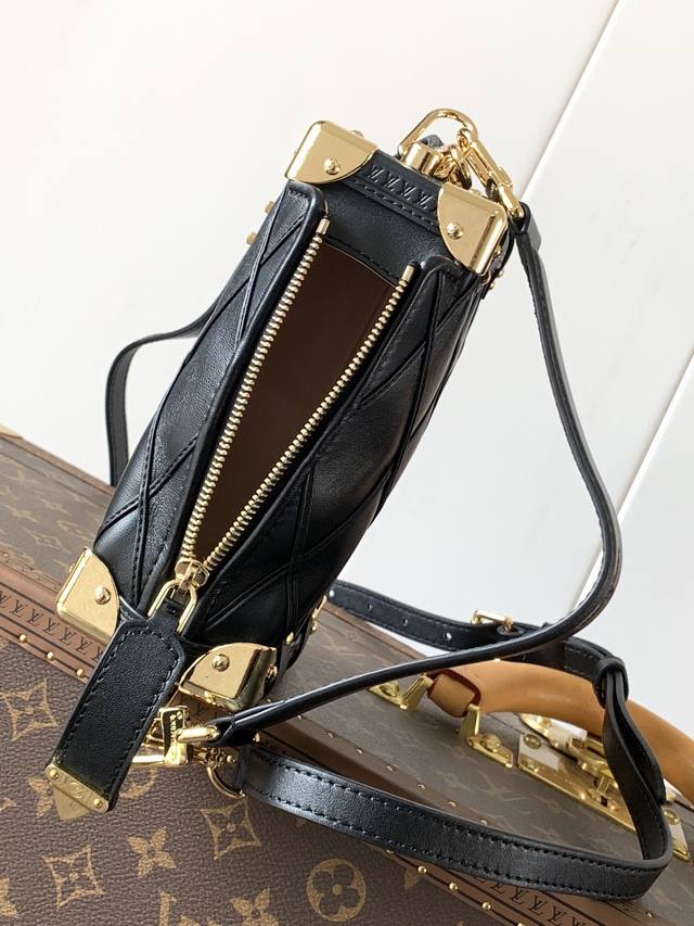 Side Trunk 手袋以品牌经典硬箱为蓝本,选用绗缝牛皮革塑造箱形轮廓,点缀加固包角、铆钉等考究金属件,再为拉链开合创意衔接 S-Lock 锁扣。