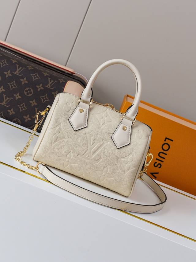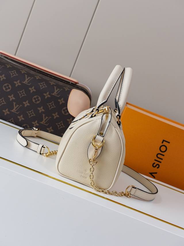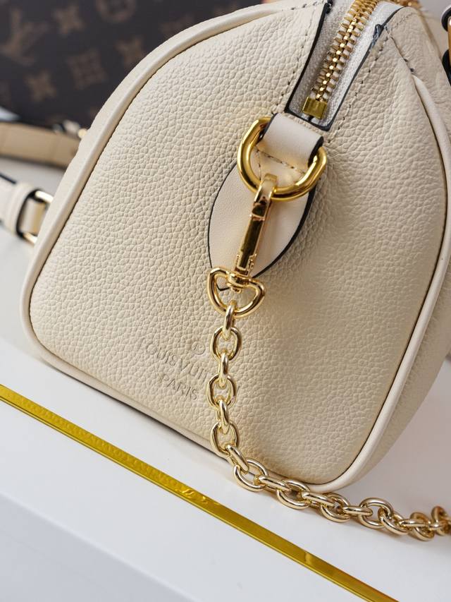 动态163C01芯片 M58954米白 顶级原单 独家背景实拍 本款 Speedy BandoulièRe 20 手袋选用 Monogram Empreinte 皮革演绎经典设计,搭配织物内衬和顶部手柄,唤起对 20 世纪品牌旅行袋的记忆。可拆卸链条皮革肩带成就舒适肩背和斜挎体验。