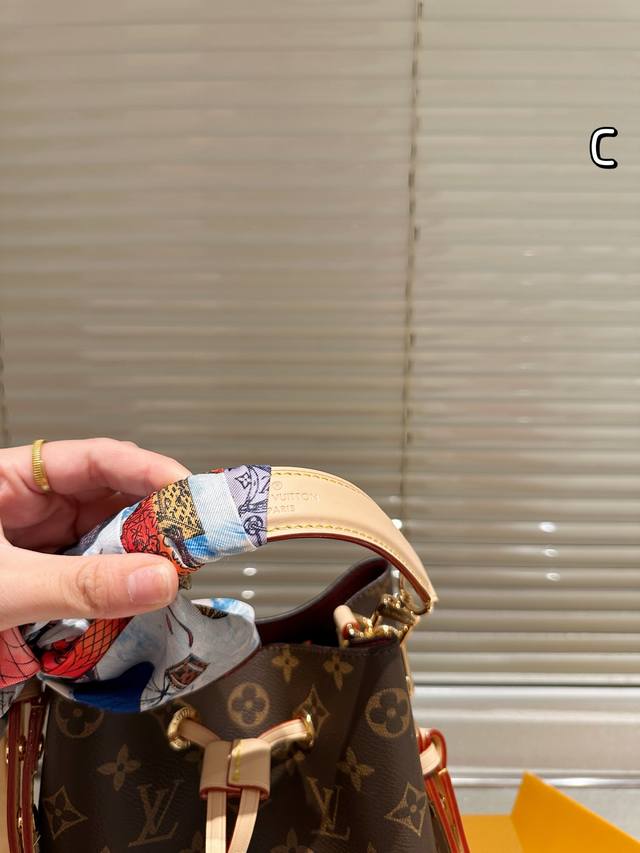 Lv Neonoe 水桶牛皮原单系列 对比原版软底。Lv 路易威登20新款Neonoe抽绳水桶包单肩女包Louis Vuittonm44022 香槟包诞生于1932年的香槟酒袋 彩色超细纤维粘合内衬,金色金属饰件,束绳闭合,配有摁扣的可调节长包带,拉链内袋。尺寸20