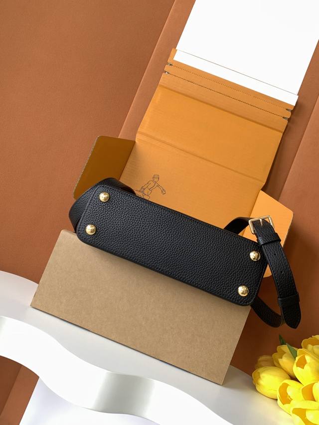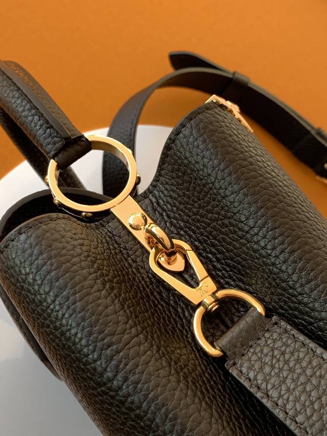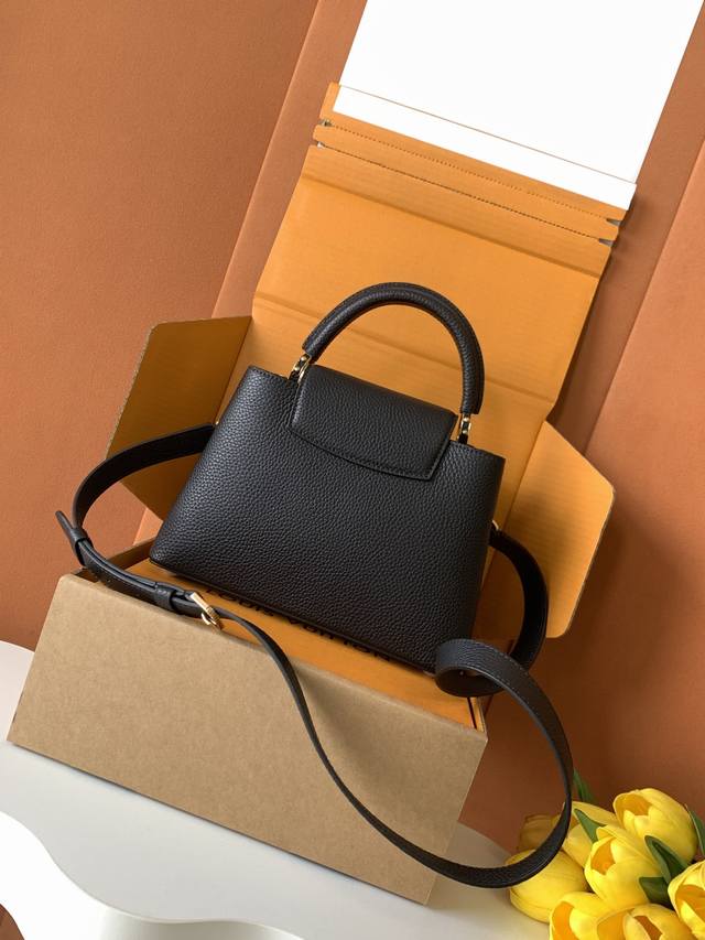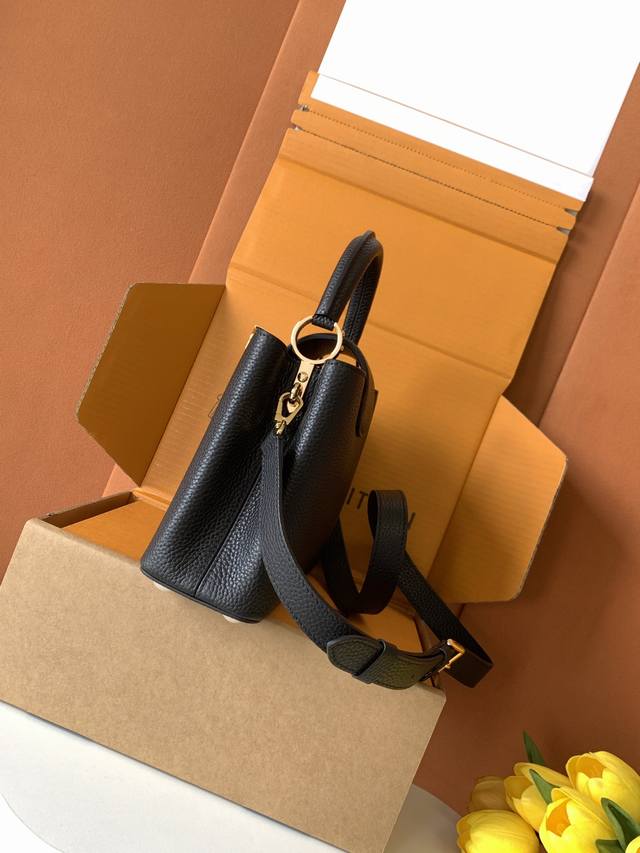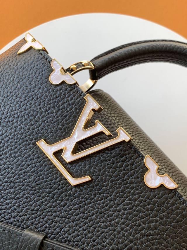 特级全钢 M25404 黑色金 本款Capucines Bb手袋取材经典Taurillon 牛皮革,以恰宜尺寸游刃昼夜场合。贝壳质感Monogram 花卉点缀包身上缘,与雅致金属件相得益彰。内里隔层设有多重口袋,可拆卸肩带提供多种背携选择,27 X17.3X9厘米 长度X高X宽 Taurillon 牛皮革