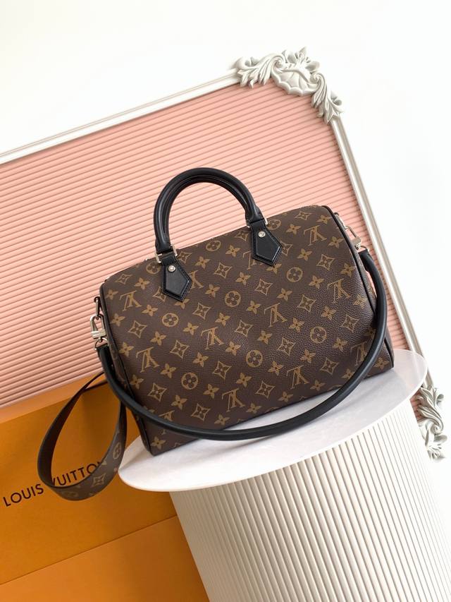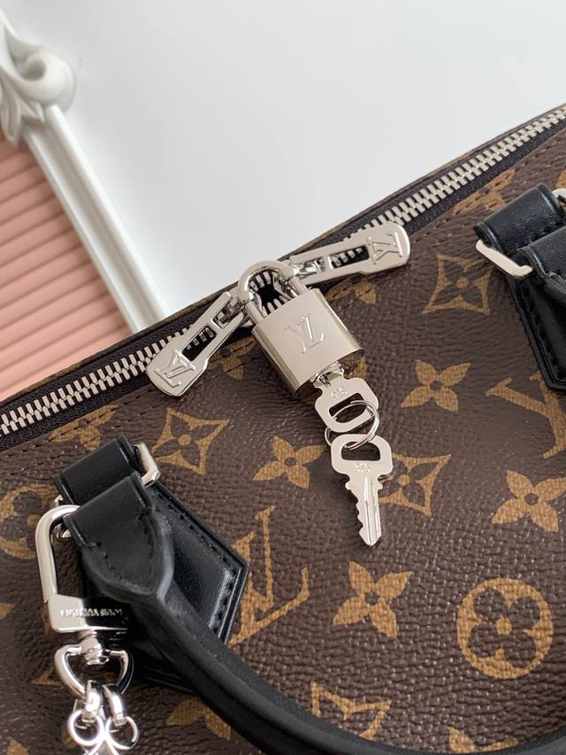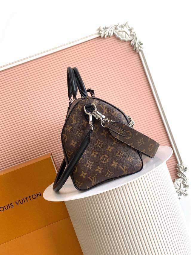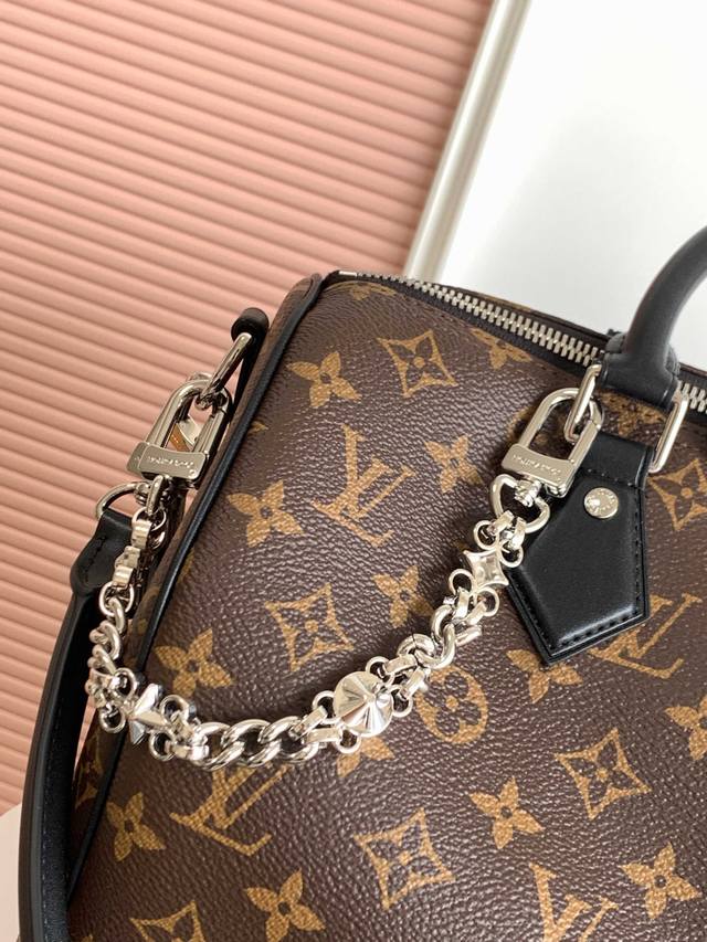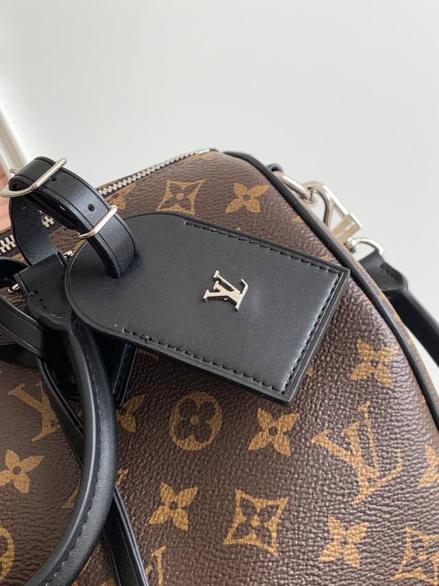 Speedy Soft 30 Dark 手袋以瞩目风姿成就旅途良伴。Monogram 涂层帆布包身融入皮革饰边和哥特风链条,充裕构型内设拉链口袋,可妥善保管护照和其他重要物品。名牌和流苏诉说工致细节,Toron 手柄再添新颖一笔。