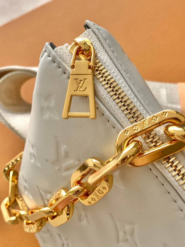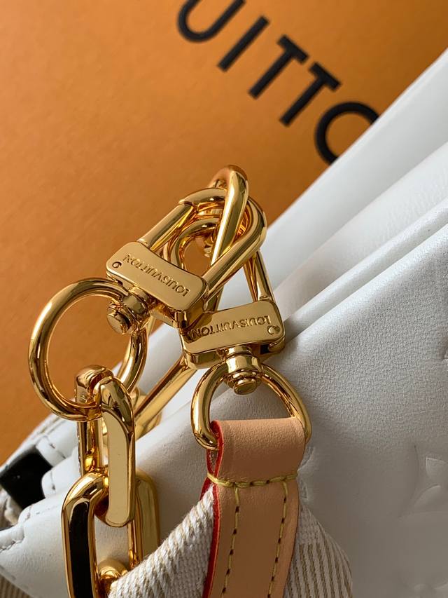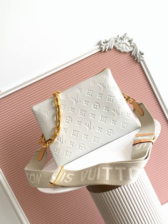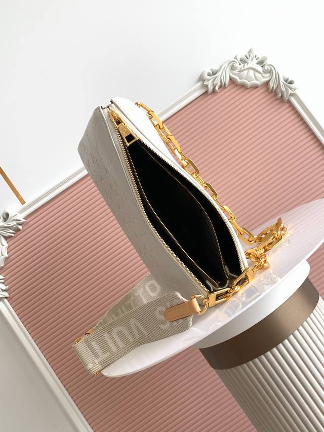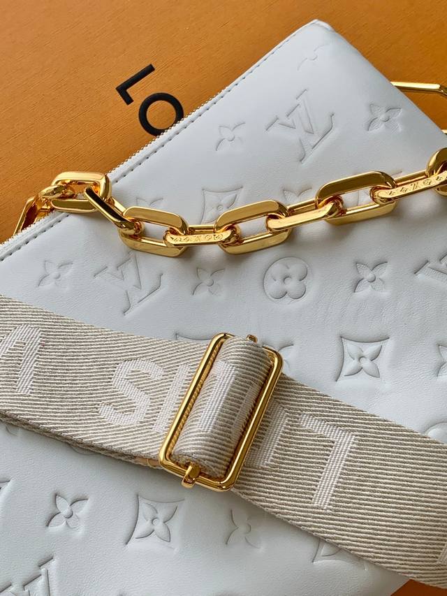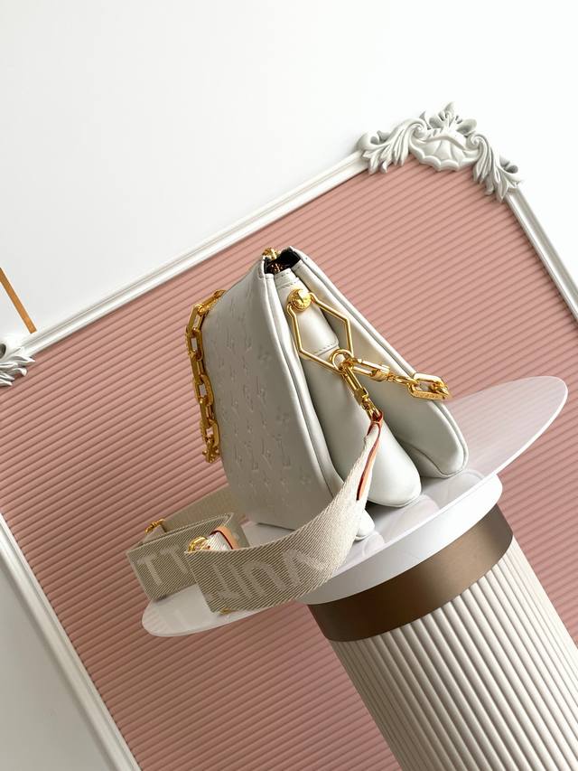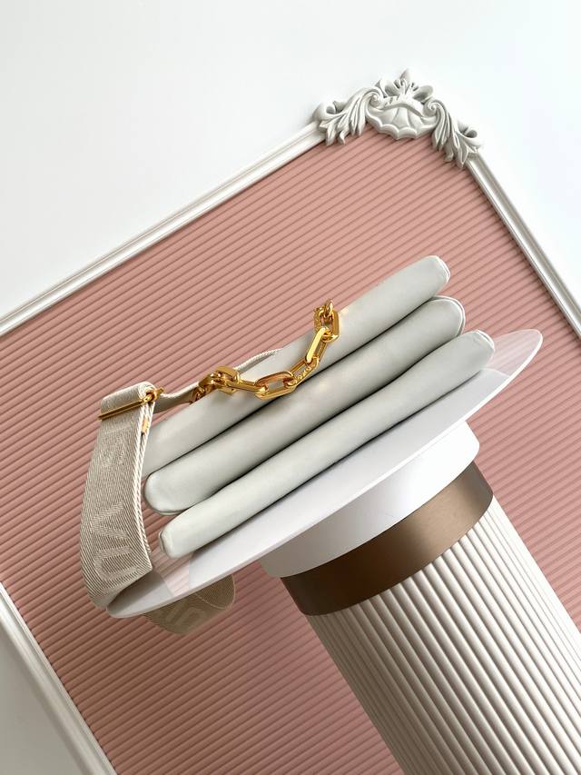 M21262白色 压纹蓬松羊皮革打造靠枕构型,为简约设计注入前卫风范。可利用肩带斜挎或作为链条法棍包,亦可舒适携于腋下。