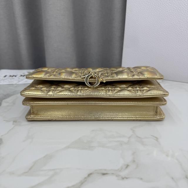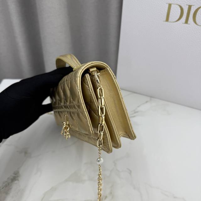 0980羊皮金色 Lady Dior 珍珠手拿包 这款手拿包是本季新品,顶部搭配手柄,优雅实用,令 Lady Dior 系列更加丰富。采用羊皮皮革精心制作,饰以藤格纹,翻盖设计搭配D.I.O.R.吊饰提升格调。款式实用,设有多个隔层和卡槽,可收纳各种日常用品,是日装和晚装的理想良伴。顶部手柄,可拆卸链条以珠饰点缀更显精致,可手提或斜挎。尺寸:21 X 11.5 X 4.5 厘米 编码:0980 正面D.I.O.R.吊饰 翻盖开合 2 个内部隔层 后侧贴袋 3 个卡槽 顶部皮革手柄 可拆卸的链条点缀以珠饰