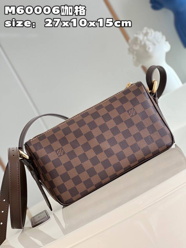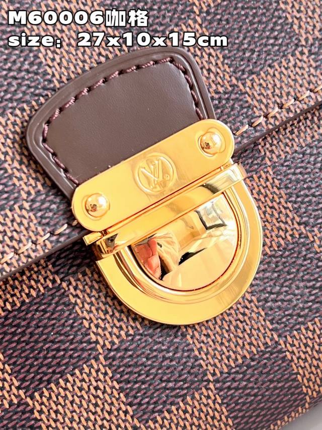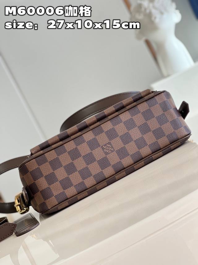 顶级原单 独家实拍 M60006咖格 中古斜挎 以 Damier帆布制造,内部空间宽敞,设有一个有盖外袋。Damier帆布袋身,米白色微纤维衬里,光面皮革包边 亮金色配件 拉链开合 内贴袋 接裆式外口袋以垂盖配按锁开合 肩背式 肩带设有肩垫,可调整长度 配长短双肩带 单肩 斜挎 可自由切换 尺寸:27*10*15Cm 长*宽*高