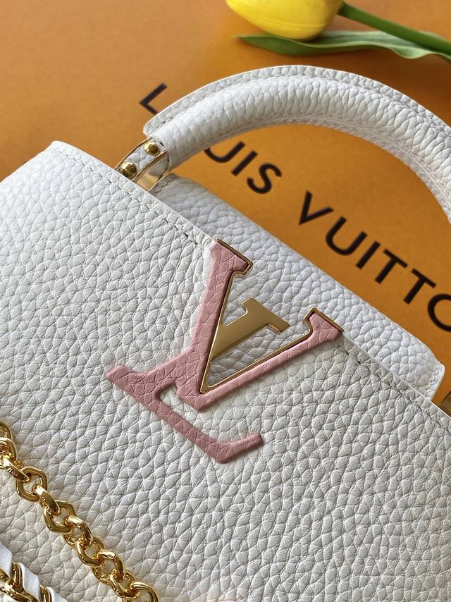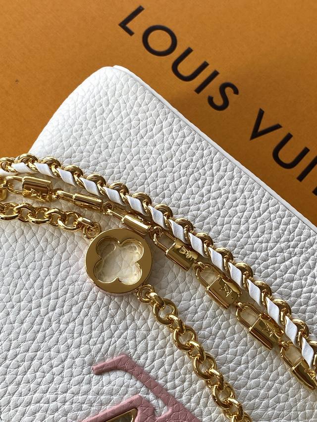 出厂价P 特级全钢 M11906 白色金 进口牛皮动态芯片 本款 Capucines Bb 手袋出自 Trilogy 系列,以 Taurillon 牛皮革和耀目金属件传递典雅风范。华美链条点缀迷你挂锁和珐琅 Monogram 花卉,可外置或内收的翻盖开启多重口袋,考究设计实现多种背携体验。 21.0 X 13.6 X 8.0 厘米 长 X 高 X 宽