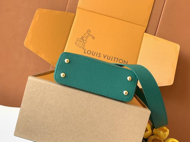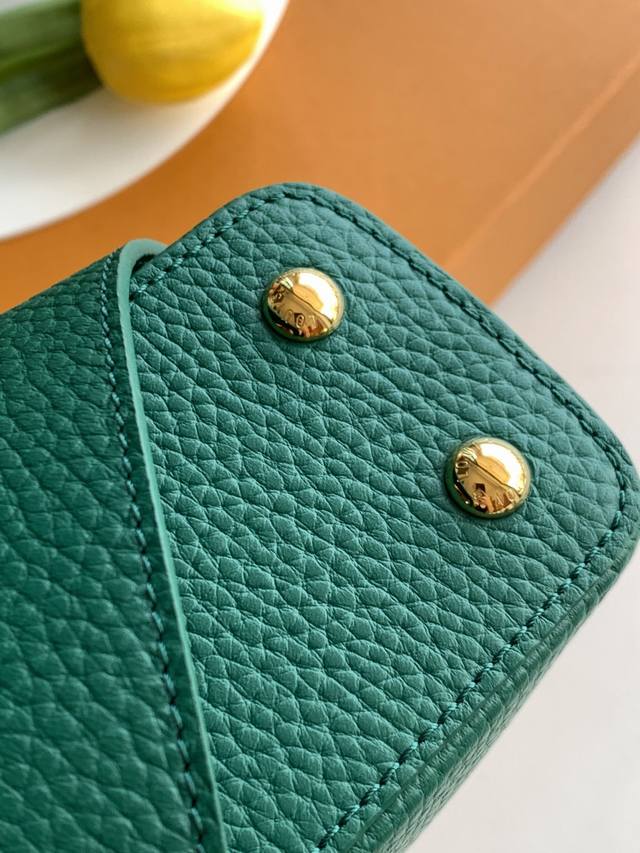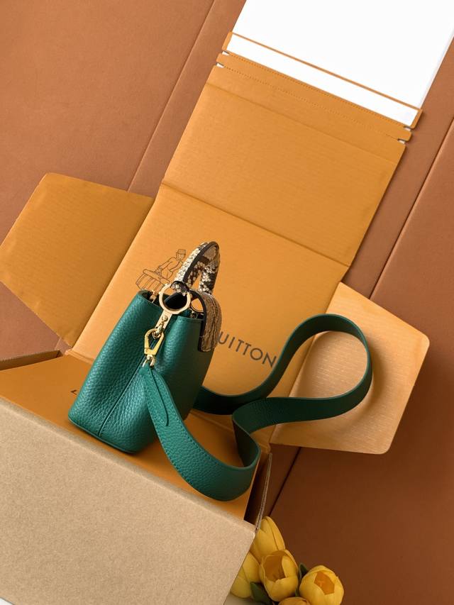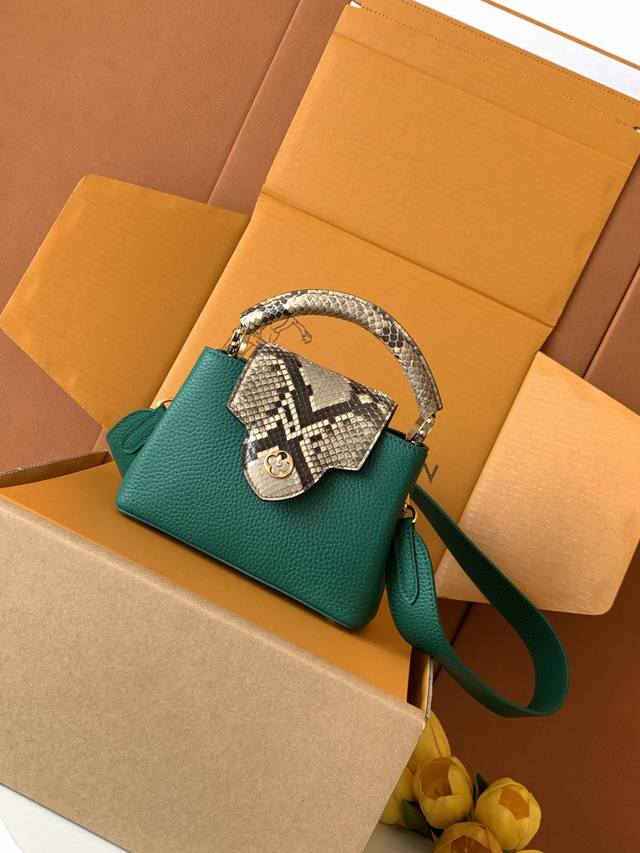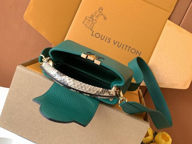 出厂价P 全钢五金 进口牛皮N80931深绿配亮光蟒蛇金扣 Capucines Bb手袋 法国进口小牛皮,闪亮的金属饰件,特有的Capucines搭盖既可收入包内展示字母标识,又可外翻 呈现Monogram Flower图案 Size:21 X 14 X 8 厘米
