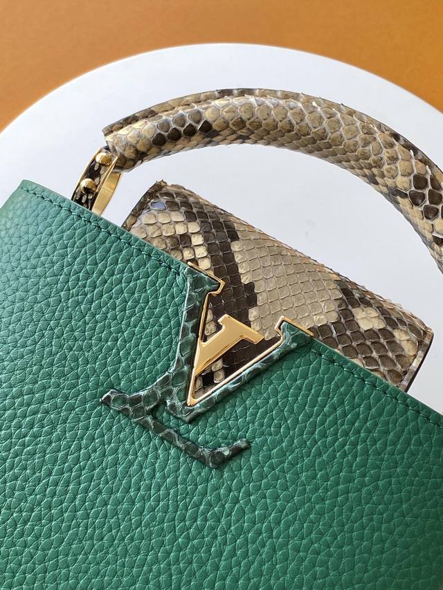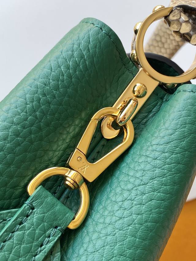 / 出厂价P 全钢五金 进口牛皮N80931深绿配亮光蟒蛇金扣 Capucines Bb手袋 法国进口小牛皮,闪亮的金属饰件,特有的Capucines搭盖既可收入包