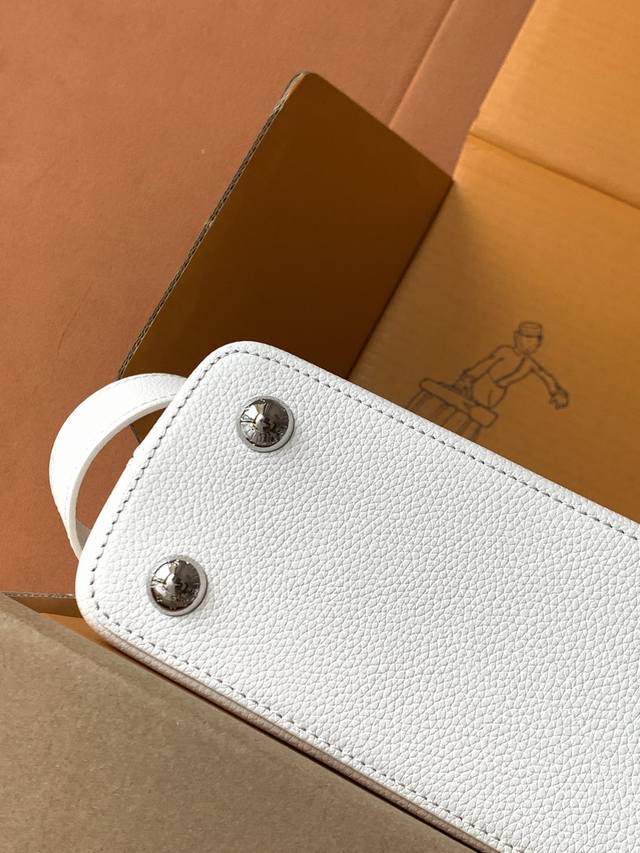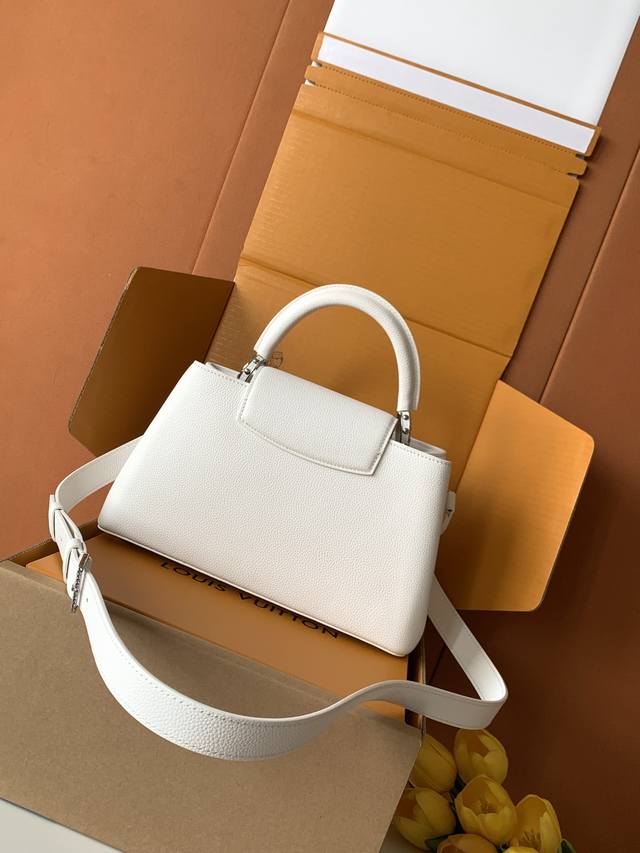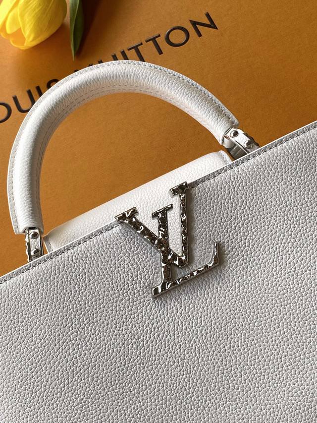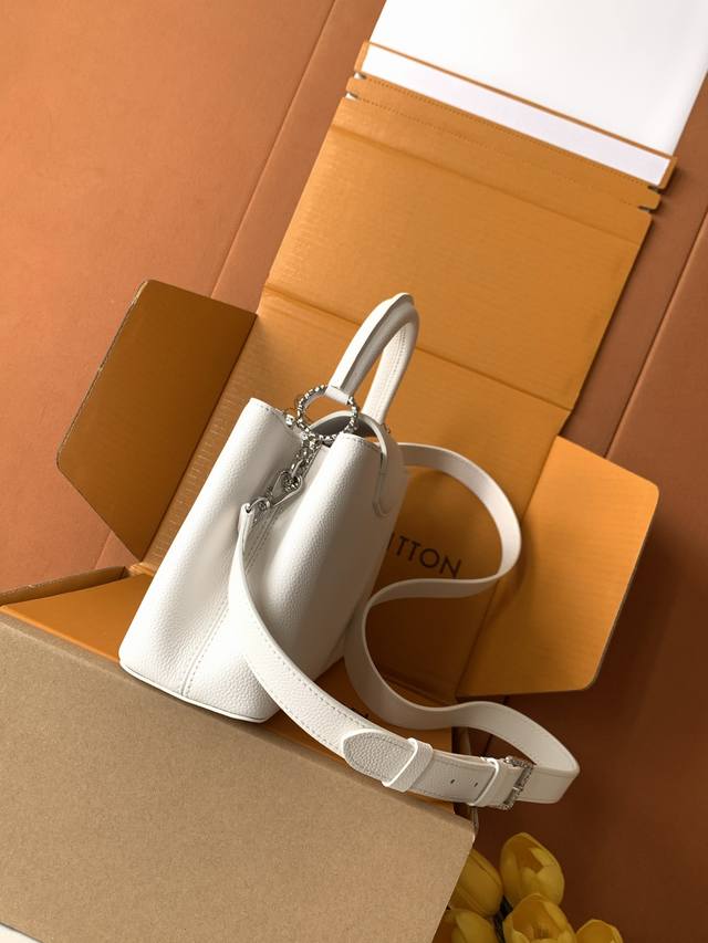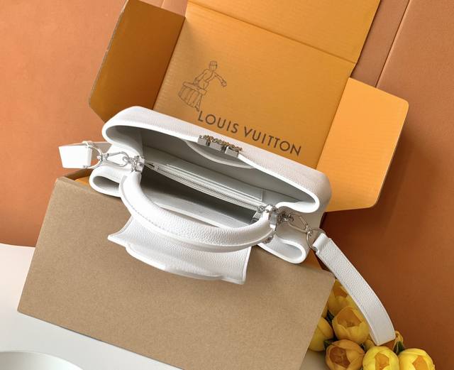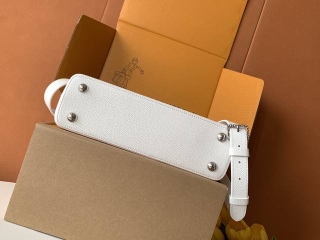 出厂价P 全钢五金 进口牛皮 变码芯片 特级配全套包装 M24672进口牛皮白色银扣中号本款Capucines East West中号手袋出自Ivcrush系列