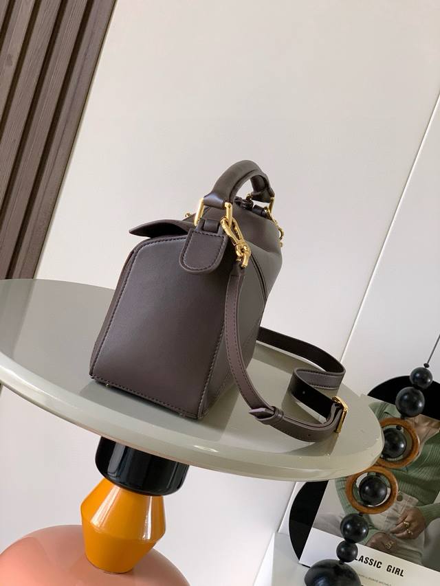 原厂皮 新版本几何包小号纳帕羊皮革 Featherlight Puzzle 手袋, 原厂进口纳帕小牛皮以别具一格的几何线条勾勒长方体造型。柔软轻盈的纳帕皮革为手袋注入随性慵懒的风格。*可肩背、斜挎或手提*可拆卸可调节肩带,饰有旋转卡扣*拉链开合,铰接式拉链头*一个外部拉链后袋,一个内部插袋*可拆卸,饰有隐秘口袋和气球骰子*长方形金属脚钉*这个小尺寸版本采用柔软纳帕小牛皮革制成*小号Puzzle 可以容纳例如一只大号钱包所有尺寸的手机和太阳镜斜、肩背、手拿或顶部提手携带*可拆卸 颜色:布朗尼深棕 款号:90