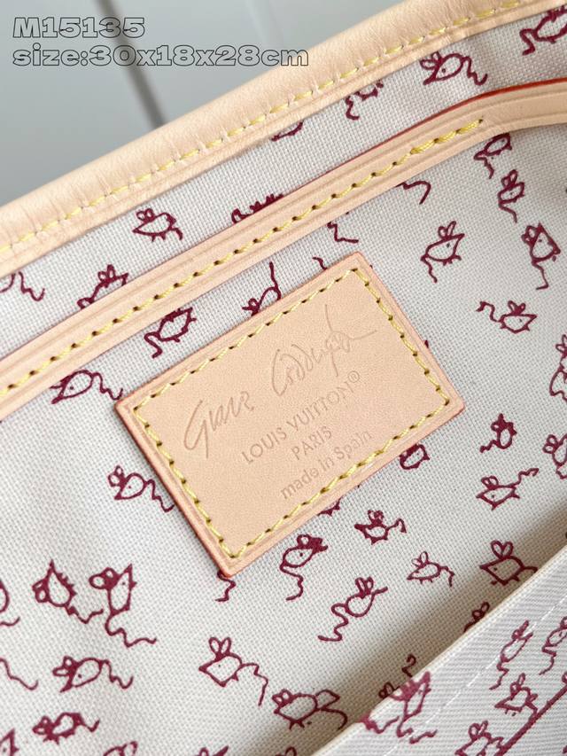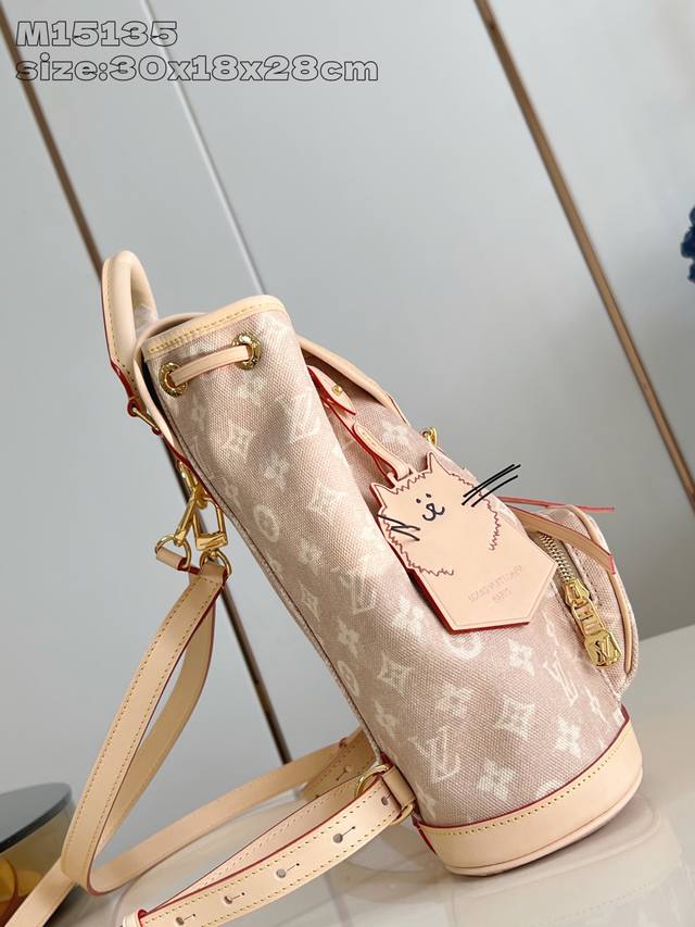 原厂皮 独家实拍 M15135 本款 Montsouris 小号双肩包出自 Lv Travels With 系列,聚焦时尚偶像兼艺术家 Grace Coddington 设计的妙趣 Meowgram 图案,彰显其对猫咪的热爱之情。帆布包身搭配可拆卸猫咪造型钥匙包,充裕空间可收纳日常所需,随附短款钱夹。30 X 18 X 28 厘米 高 X 宽 X 长度