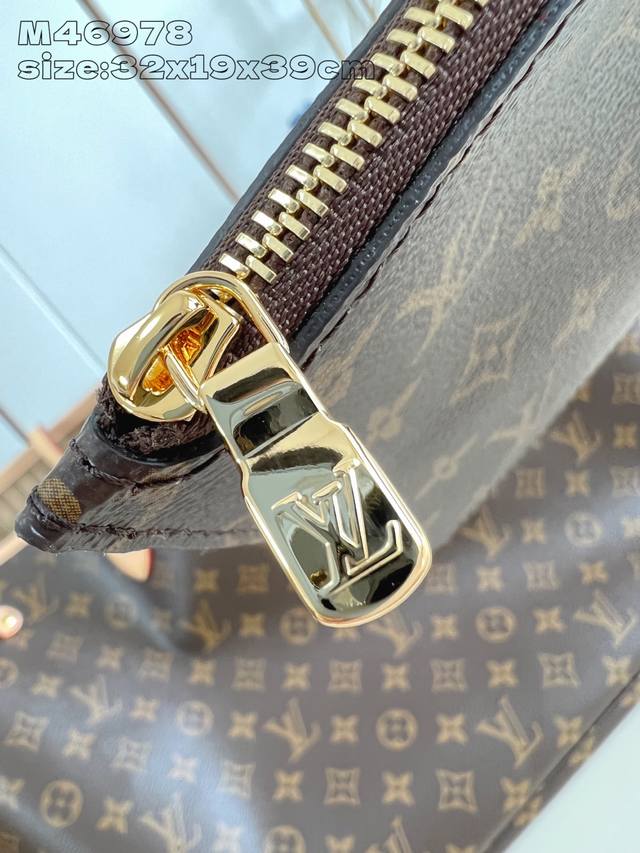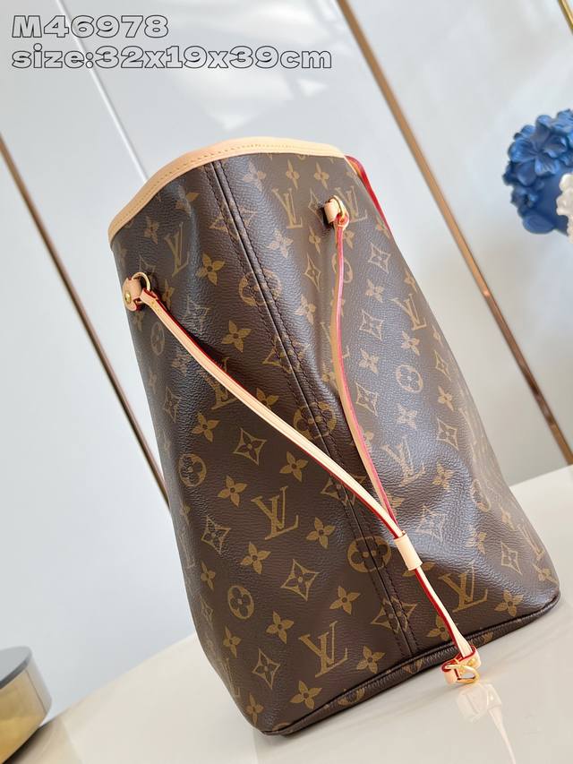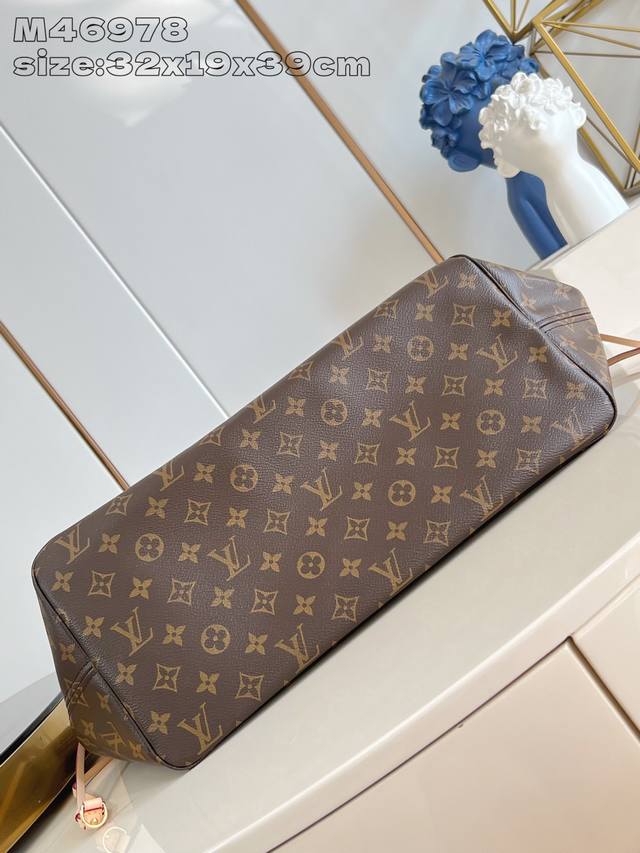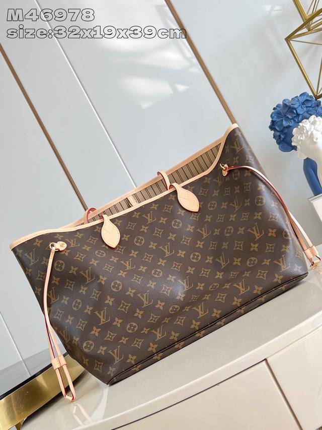 / 原厂皮 独家实拍 M46978 本款 Neverfull 大号托特包为柔软 Monogram 帆布勾勒牛皮革饰边,于宽敞构型融入缤纷织物内衬。两侧饰带无论束紧或