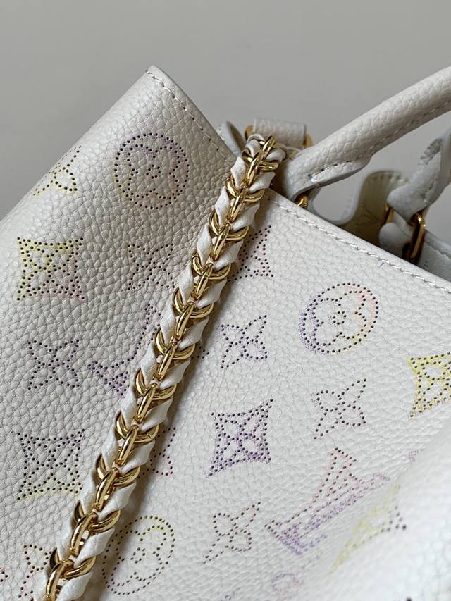 顶级原单,变码芯片 M15116水彩 M14316宝蓝M5 0黑色 M5 1 灰色 M5 3米白 顶级原单 Bella Tote 手袋取材柔软镂花穿孔牛皮革,呈现温和褶裥与垂坠效果,点缀宛如珠宝的链条。充裕构型设有齐整内层,满足日常出行所需,可为休闲着装注入摩登韵味。32.0 X 23.0 X 13.0 厘米 长 X 高 X 宽
