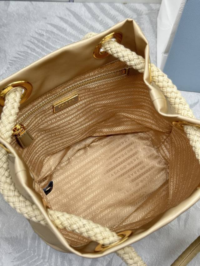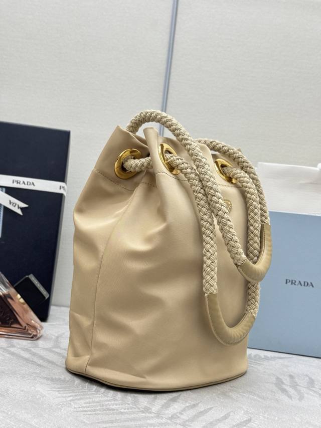新款水桶包1Be082走秀款 这款Re-Nylon 手袋的設計采用尼龙面料和小牛皮。獨特的組合添上迷人點綴。滑動式繩索手挽凸顯這款手袋的靈活百搭,方便手提或肩背