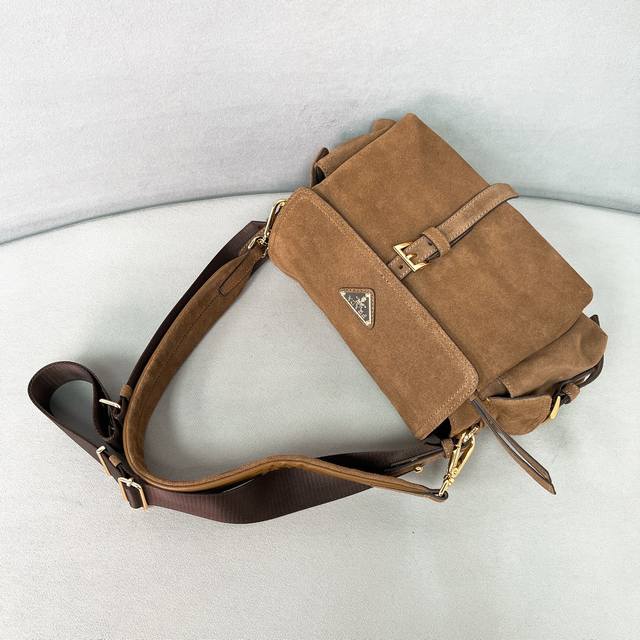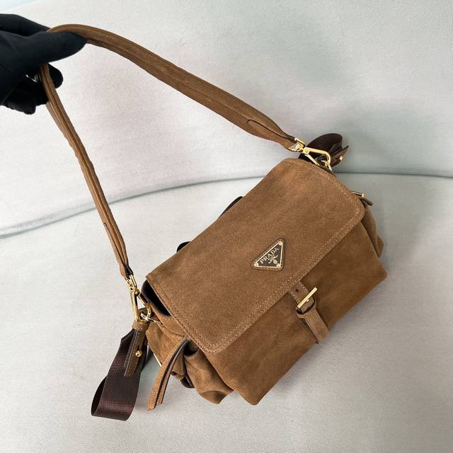 新款邮差包1Bd394麂皮 这款手袋完美融合精致与功能性,采用进口麂皮轮廓柔和,配有多个口袋。轻盈实用的设计结合运动与百搭元素,饰有涂珐琅三角形金属徽标,搭配皮