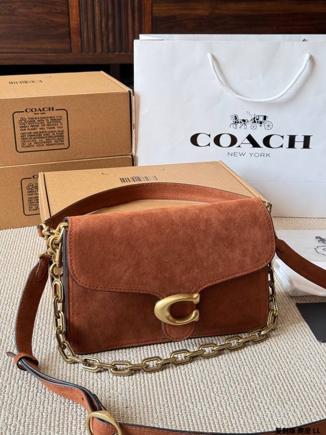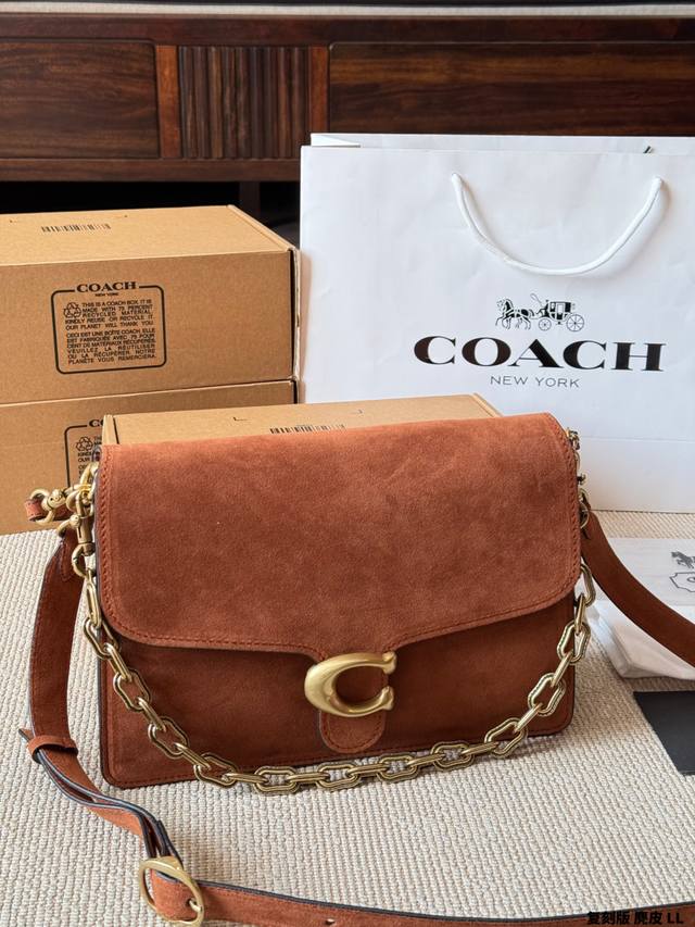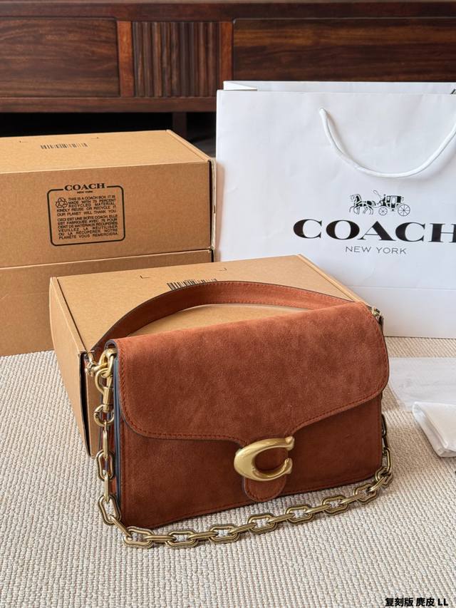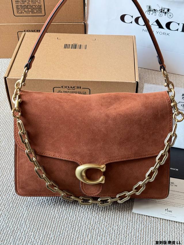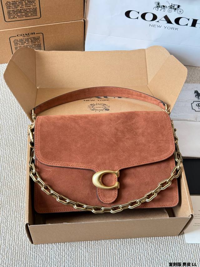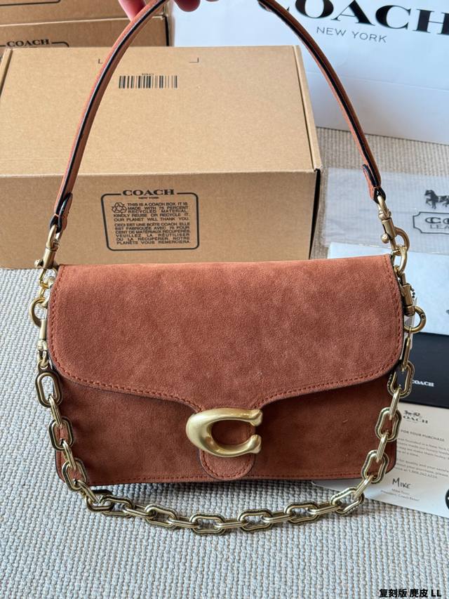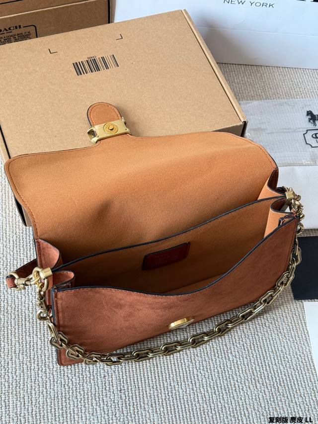 复刻版 麂皮 Coach Chain Tabby麂皮链条包 Coach Chain Tabby麂皮链条包,焦糖棕色麂皮+黄铜链条,复古又高级。经典C扣+柔软包盖,质感满分! 链条可单肩、腋下、斜挎,百搭灵活,秋冬大地色系穿搭超适配 。麂皮细腻柔软,记得避免刮擦和沾水哦~通勤、休闲都能轻松驾驭,是秋冬必入的时髦单品! 尺寸 30 20Cm 26 16Cm