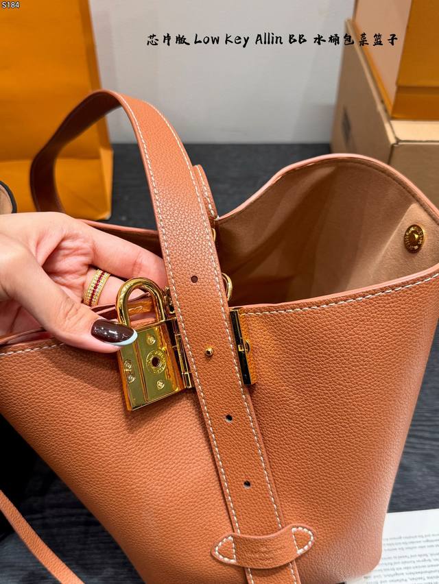 礼盒 芯片版 新款Low Key Allin Bb 水桶包菜篮子 采用粒面牛皮革打造立体包型,耐磨又能装。 做旧金属件+Lv挂锁头点缀复古质感,可拆卸Monog