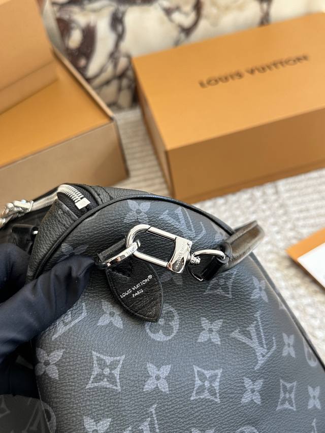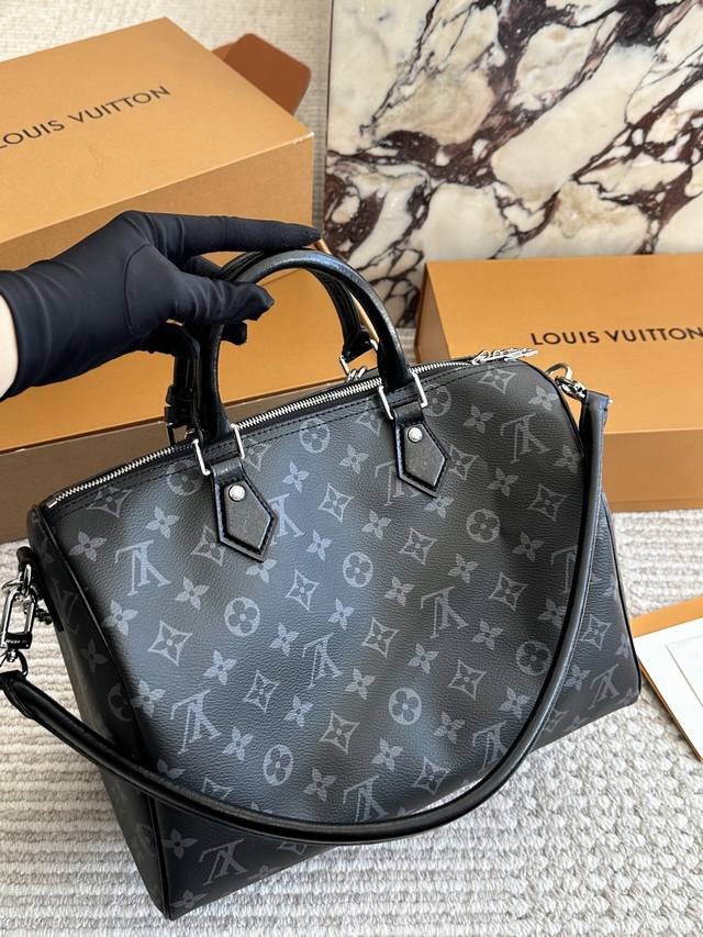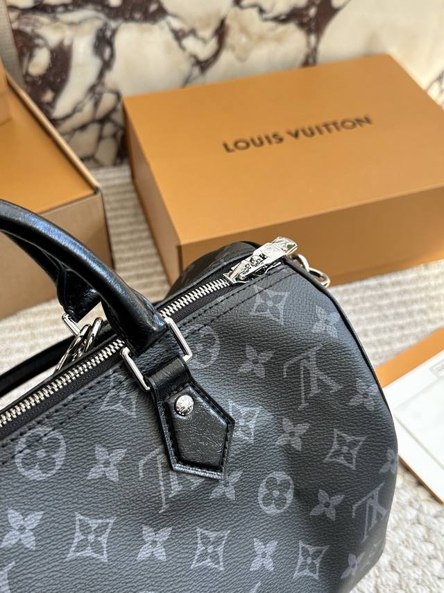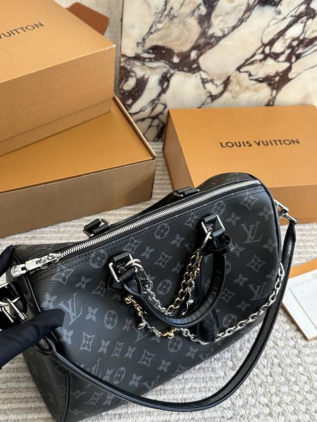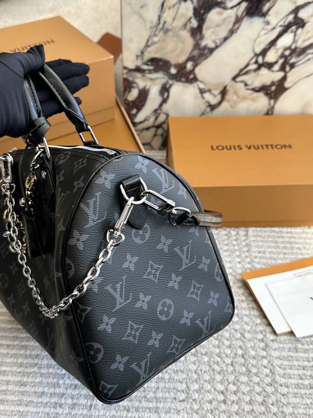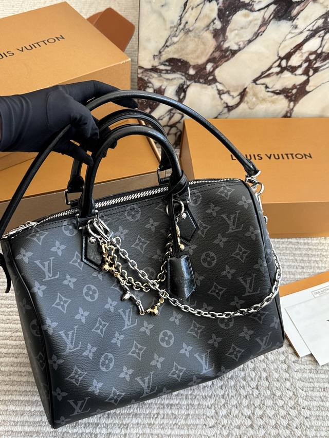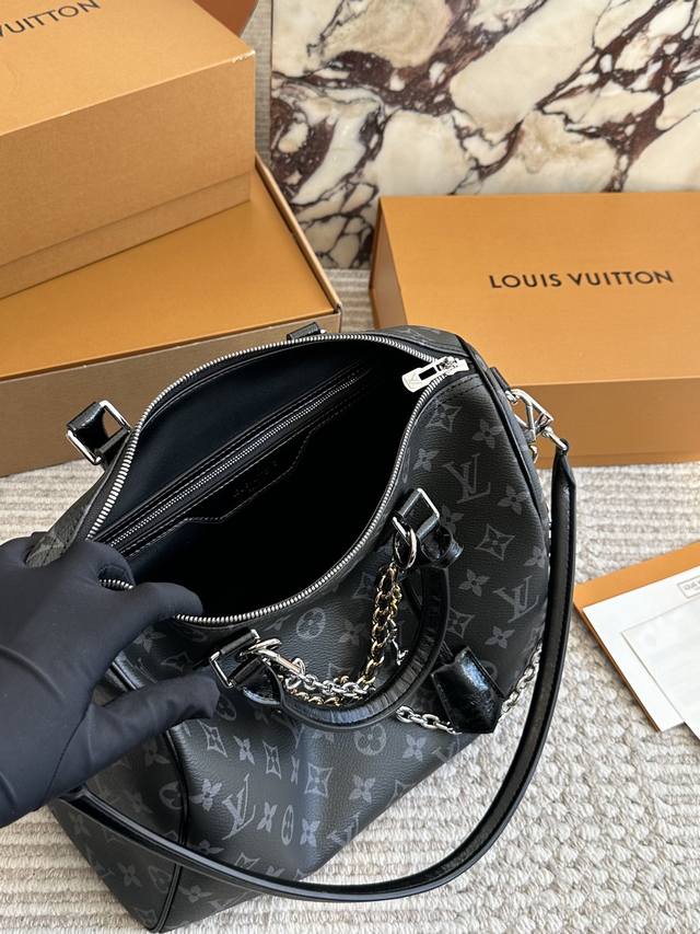 复刻版 Lv Speedy Soft 30黑银老花包 Lv Speedy Soft 30黑银老花包,经典Monogram涂层帆布+黑色皮革饰边,银色链条超有现代感十。尺寸 30X21X17Cm,容量适中,通勤Or短途旅行都很Ok 图片包装