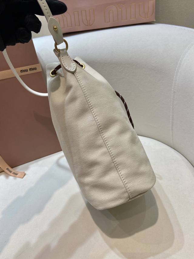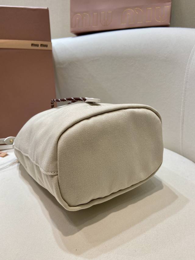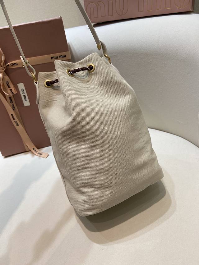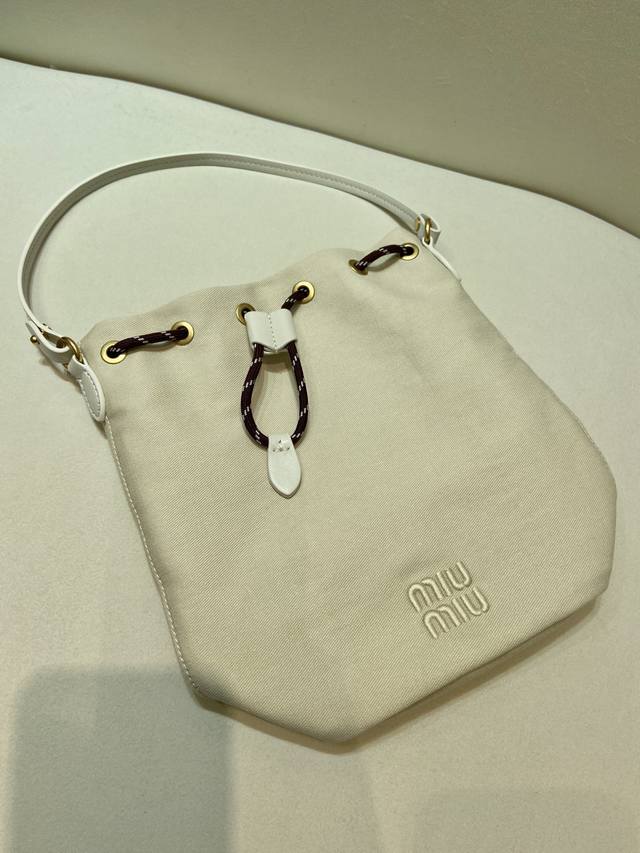 / 新款水桶包5Nr038 这款水桶包采用华达呢织物与同色系刺绣徽标,赋予了这款小袋百搭特质,双色编织饰带抽绳彰显M永风格本真,编织抽绳开合,皮革手提柄。容量空间大