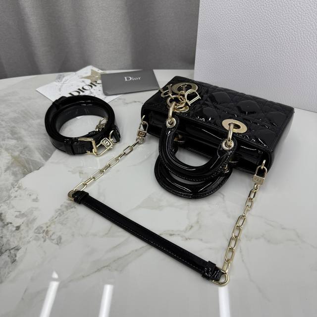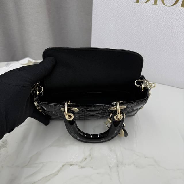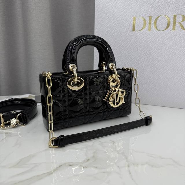 顶级原单这款 Lady D-Joy 手袋是二零二五秋冬成衣系列新品,凸显 Lady Dior 系列经典的简约美学,集中体现了 Dior 对典雅和美丽的深刻洞见。采用黑色漆皮牛皮革精心制作,饰以藤格纹缉面线,时髦典雅的设计经久不衰。搭配浅金色饰面金属 D.I.O.R 吊饰提升格调,为精美的轮廓增添一分灵动。迷你款式,搭配可拆卸的链条肩带和可调节、可拆卸的皮革肩带,可手提、肩背或斜挎,是日常造型的理想之选。 DDD 主体:羊皮革里料:羊皮革可拆卸链条肩带可调节、可拆卸的皮革肩带 DDD 内部插袋 DDD 内含