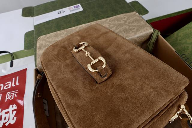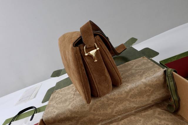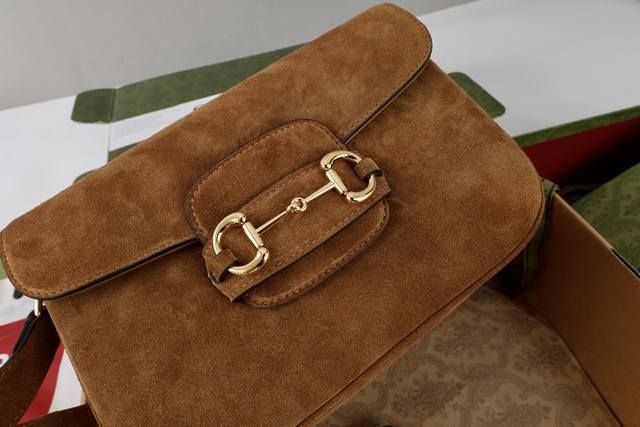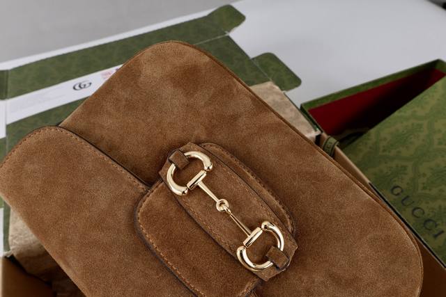 / 真皮磨砂 简介:2025秋冬系列, 这款肩背包再现品牌马术风格设计,融蕴浅金色调细节与光面软皮,搭配双环和长条配件,为Gucci Horsebit 1955系列