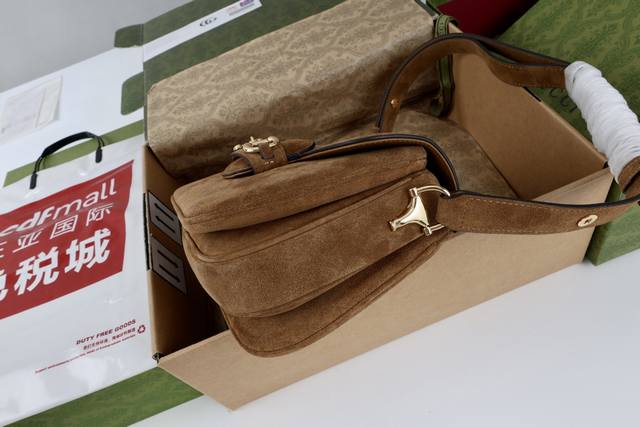 真皮磨砂 简介:2025秋冬系列, 这款肩背包再现品牌马术风格设计,融蕴浅金色调细节与光面软皮,搭配双环和长条配件,为Gucci Horsebit 1955系列