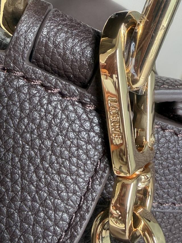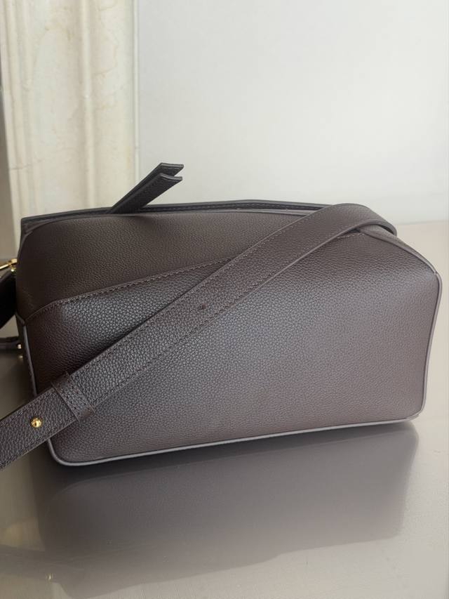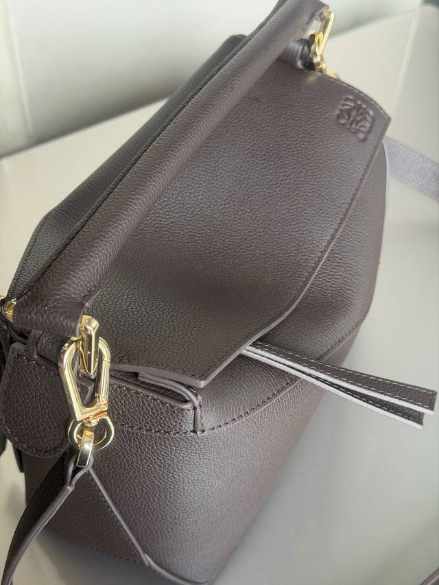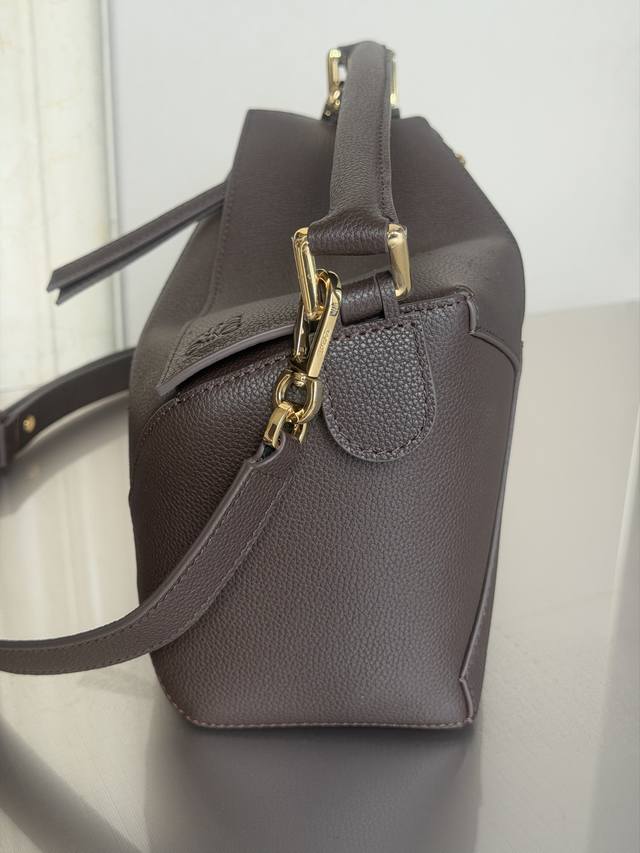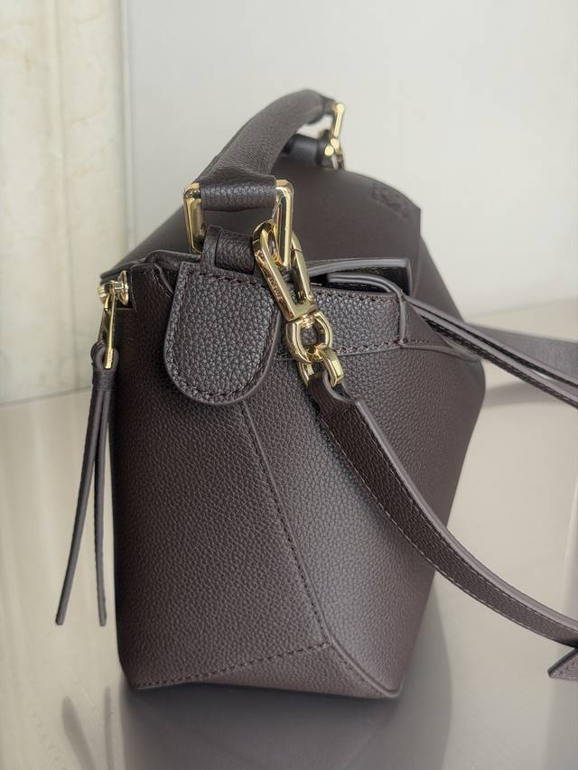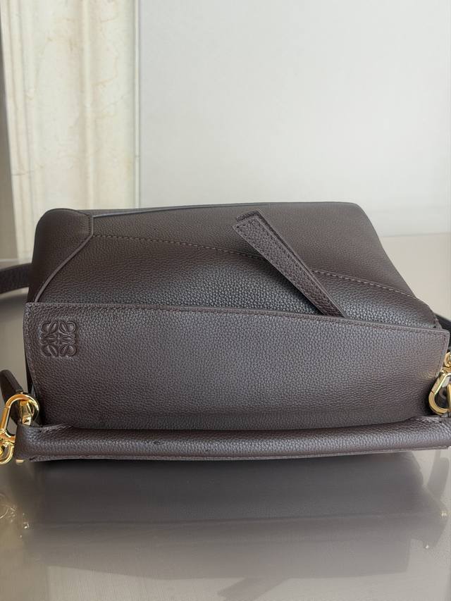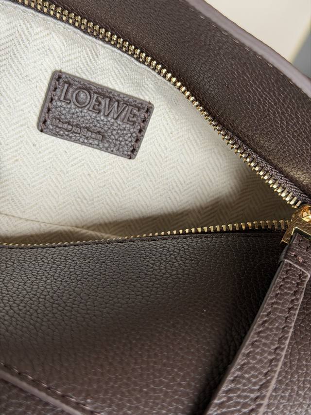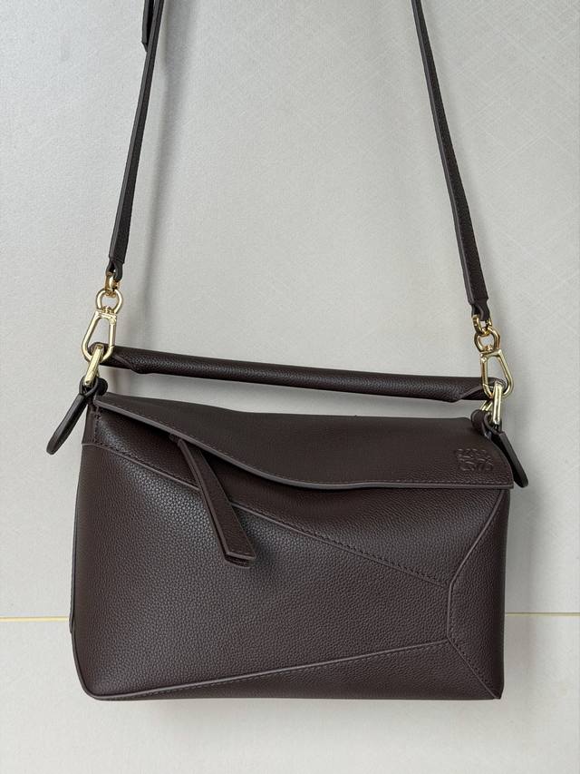 原厂皮 DDD 3001M深咖啡色 DDD puzzle DDD 小号24Cm DDD puzzle 手袋是创意总监乔纳森 安德森 Jonathan Anderson 为 Loewe 推出的首款手提包。长方体形状和精确的切割技术创造了 puzzle 独特的几何线条。此版本采用粒面牛皮革打造,饰有重叠边缘。 DDD 可肩背、斜背或手提 DDD 可拆卸可调节肩带 DDD 两个内部插袋和一个外部后方拉链袋 DDD 人字纹棉质帆布衬里 DDD Anagram 压纹 DDD
