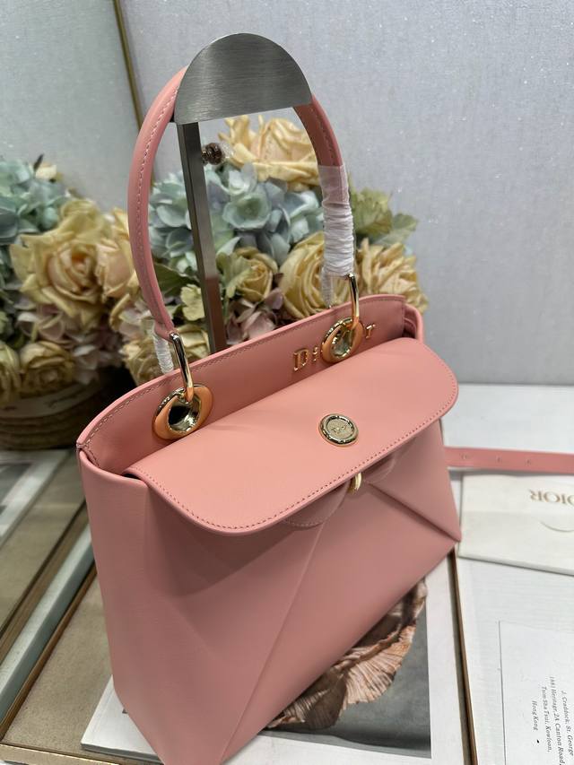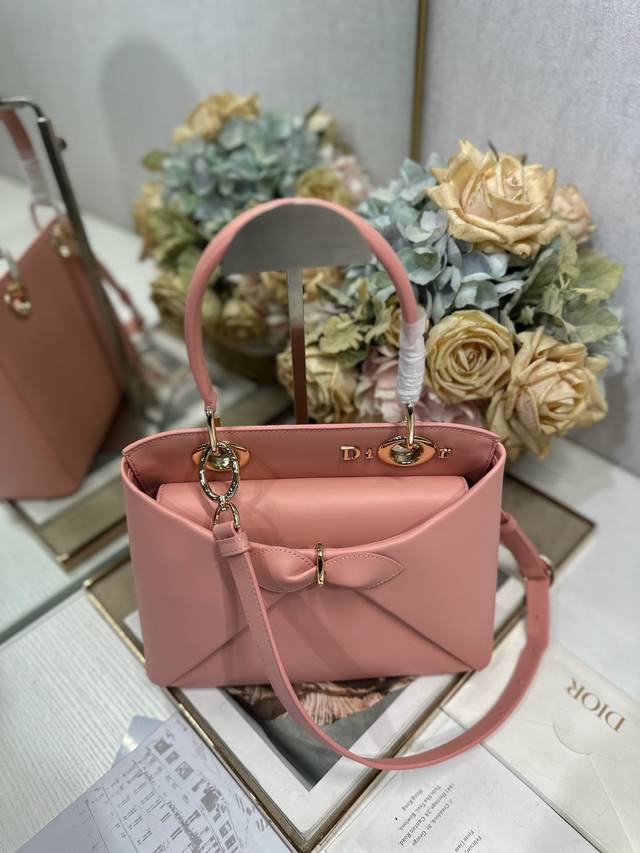正品级 DDD Dior 2026 春夏新品#蝴蝶结手提包 粉色 DDD 新设计的轮廓与造型,配色 丰富,适配多人!在夸张与优雅之间恰到好处!它的设计灵感源于迪奥先生设计的 Cigale礼服~立体的梯形包身+单手柄,造型自带优雅大气的腔调。包包的外观比较低调,几乎没有什么明显的大Logo。离近点再看,才发现原来Anderson把Dior字母Logo和包包提手的圆孔融合到了一起。 DDD 包包既有辨识度,也完全不是张扬挂的,整体散发着那种不动声色的高级感!值得一提的是,这款包还搭配了一条皮质长肩带。尤其出门