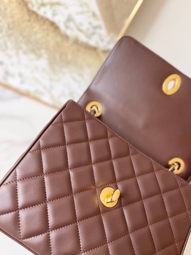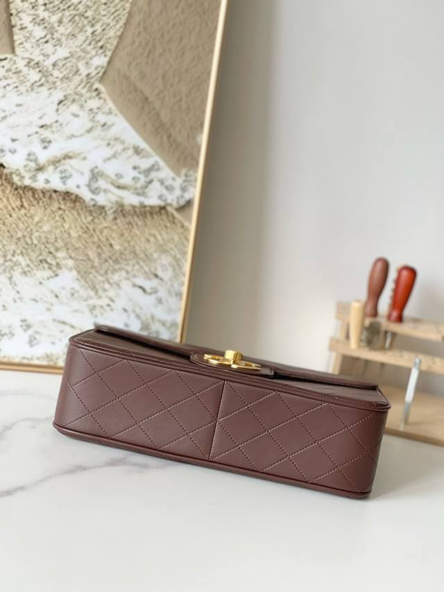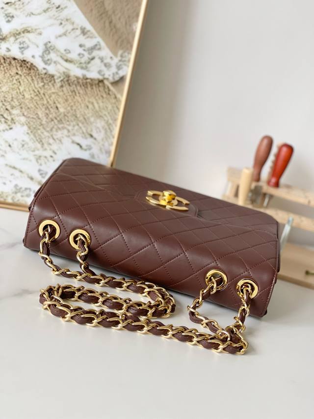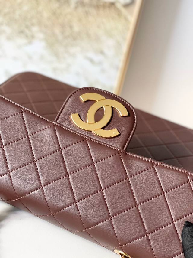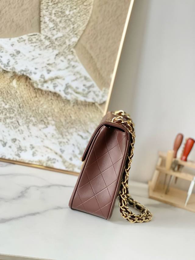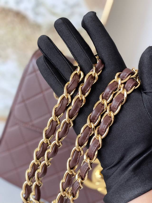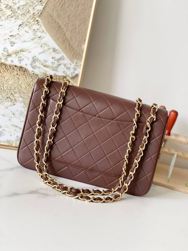 贝嫂同款 Chanel 羊皮 棕色 DDD 绝版大金扣包 DDD 现货 Chanel Classic Flap Bag是1983年老佛爷接手Chanel后对香奈儿女士的设计稍作改动后重新推出的作品,也是老佛爷本人最得意的开山之作 其中很受明星们和博主们欢迎的就是这款大号Cf了 DDD 它的亮点在于这个镀金的大双C Logo,现在专柜版的Cf已经没有这样的设计了,都是小双C。贝嫂就很喜欢把这款包的链子收短,当手包使用 DDD 其采用双面口盖设计 容量在链条包中算非常大,自重很轻 可单肩 斜挎 也可以把手链收