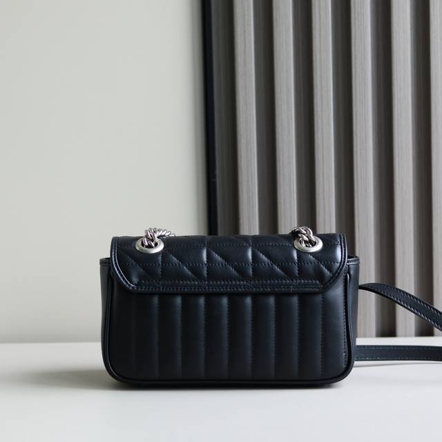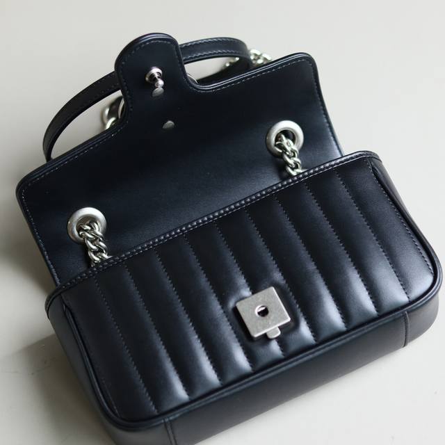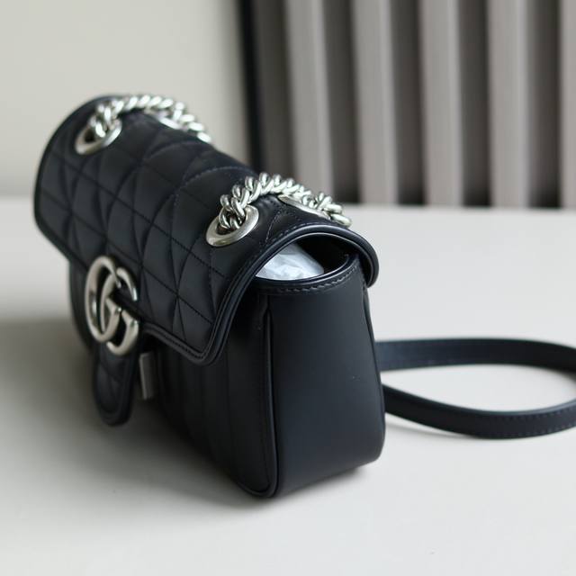 Gg Silver Marmont Aria-时尚咏叹调 系列不断大胆探索品牌的经典符号元素。作为古驰宠儿精选手袋的一员,Ggmarmont系列以其标志性的绗缝皮革和双G字母交织配件而备受推崇。在这款迷你肩背包上,经典材质融入竖版和斜纹图案,打造别具风情的几何风格设计 尺寸22*13*6Cm型号446744 DDD