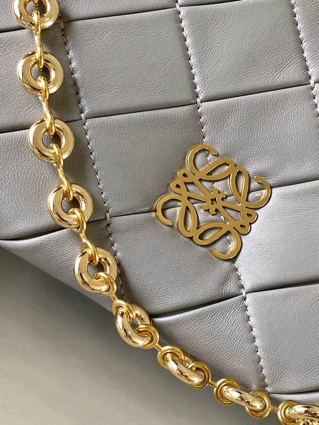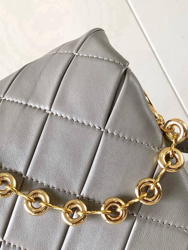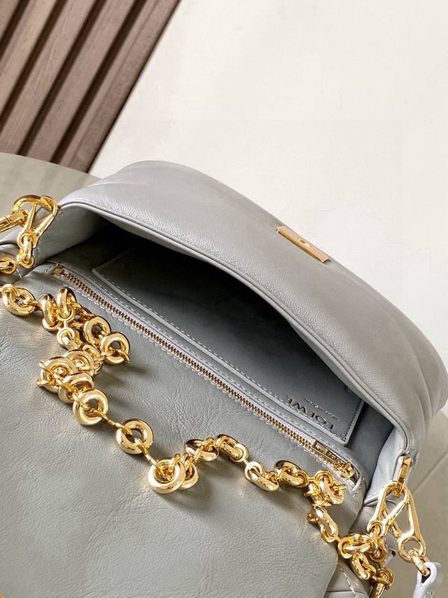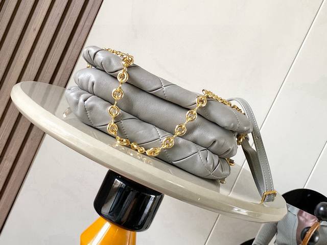复褶闪亮纳帕羊皮革 puffer Goya 手袋puffer Goya 受到了 Goya 美学的启发,通过带有鹅毛衬垫的闪亮纳帕羊皮革,带来了全新的感官和触觉维度配有可拆卸且可调节的金属甜甜圈链条和一条可拆卸皮革带子这个版本采用褶皱羊皮革经过裁剪、缝制和手工编织制成。*肩背或手拿*磁扣*这款手袋配有一根可拆卸链条和一根皮革带子*一个主要隔层,一个拉链口袋和一个插袋*纳帕羊皮革衬里 DDD 尺寸:23Cm~9Cm~17Cm DDD 款号:9076 DDD 颜色:珍珠灰 DDD