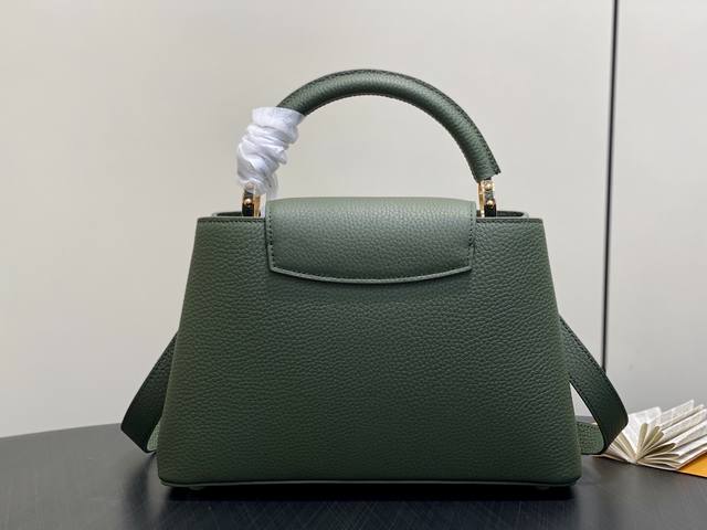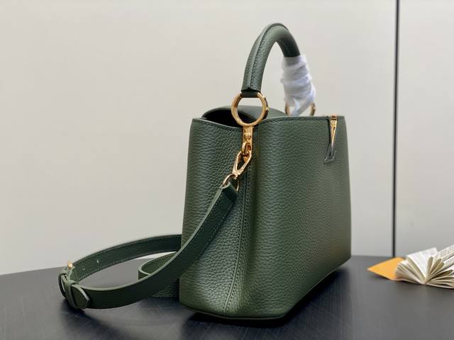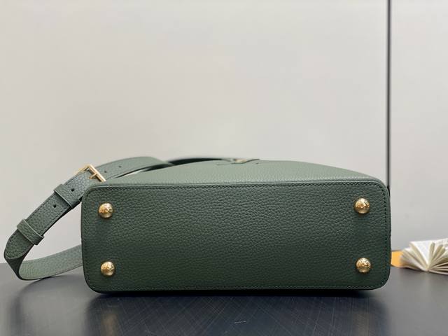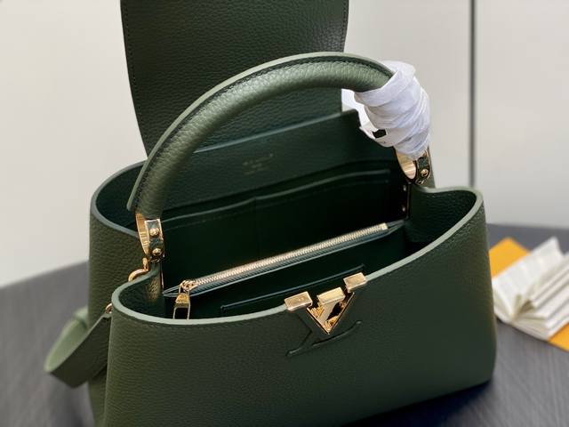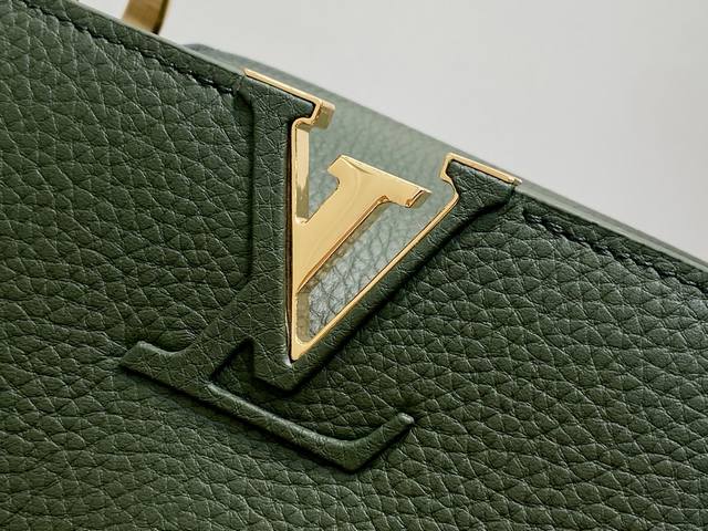 出厂价p 顶级原单 M24545墨绿色 全皮Cap那英款系列 Capucines 中号手袋 Capucines 中号手袋于 2013 年问世,以 1854 年路易威登初次开设门店的巴黎街道命名。全粒面 Taurillon 牛皮革搭配经典翻盖:外置绽放 Monogram 花卉,内收读取皮革包覆的 Lv 字母。轻巧构型适宜全天背携,可拆卸肩带提供手持、肩背或斜挎体验。31 X 20 X 11 厘米。 DDD
