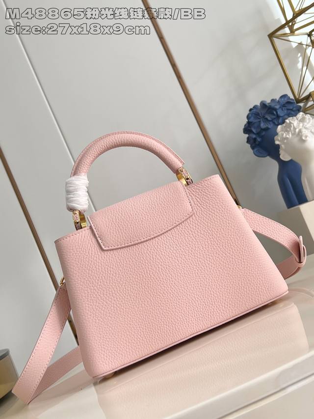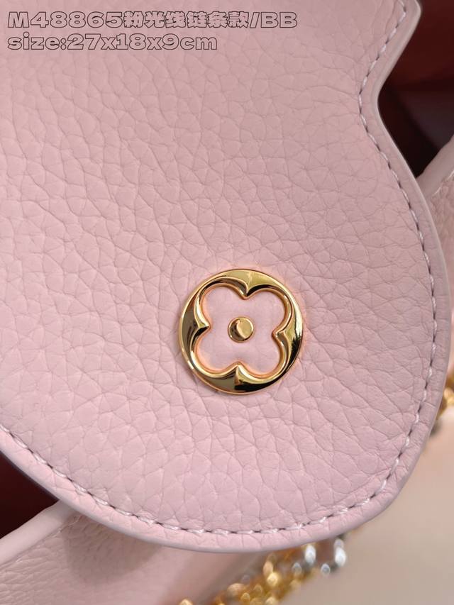 出厂价p 顶级原单 M48865粉光线链条款 小号 M27039 這款現代版Capucines Bb以雋永黑色Taurillon皮革打造,配上以珠寶為靈感的Infinity鏈條。包包飾有雙鍍鋅金屬件,包括標誌性Monogram花卉圖案,以及經太陽放射紋工藝打造的Lv Initials標誌,營造出日晷般的光影效果。包包設有多個口袋,並備有可拆式肩帶,提供單肩或斜背兩種攜帶方式。27 X 17.3 X 9 Cm 長度 X 高度 X 寬度 DDD