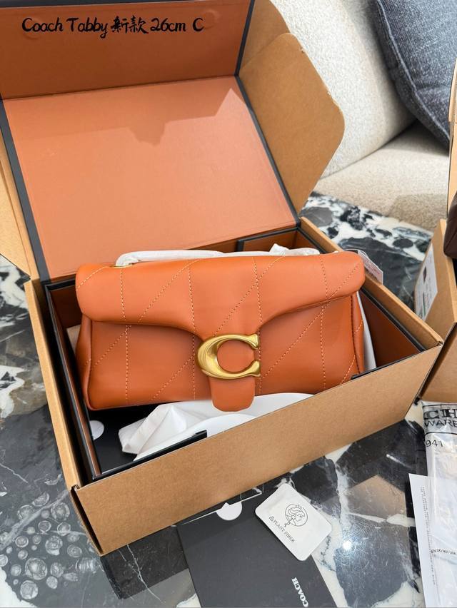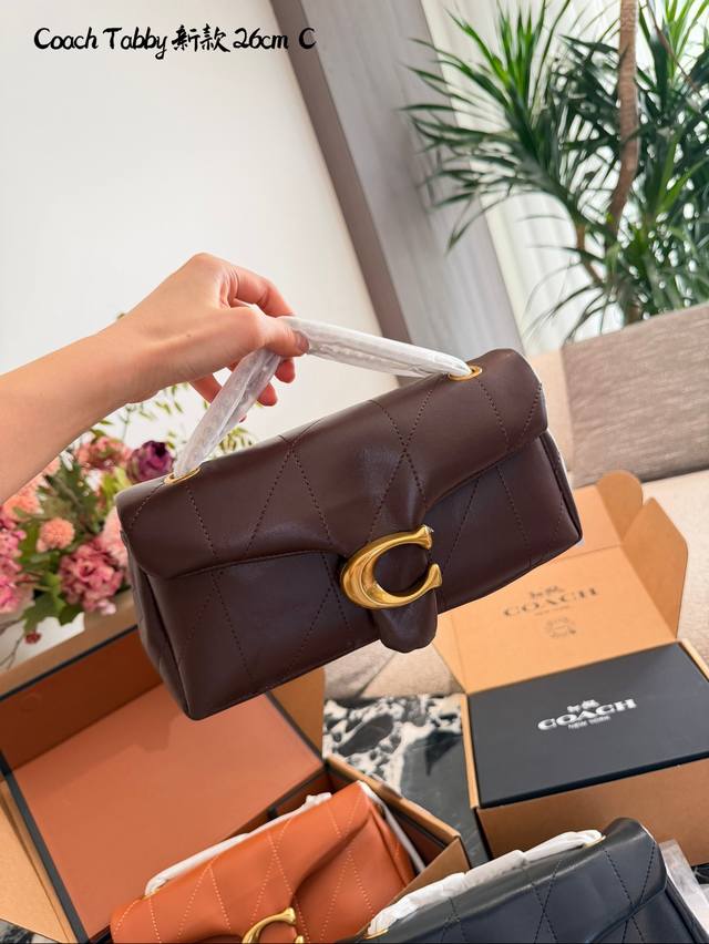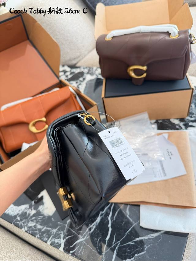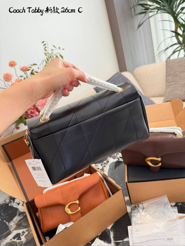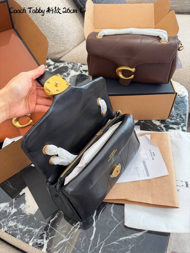 Coach Tabby 26黑金羊皮链条包 DDD C Coach Tabby 26黑金链条包,选用柔软小羊皮,经典菱格绗缝+金属C字扣,低调奢华+ 容量适中,通勤休闲都Ok。链条肩带可调节,单肩斜挎随心切换,百搭不挑衣服人。黑金配色超经典,秋冬大衣羽绒服都能轻松驾驭,优雅又有气场。配盒子 DDD