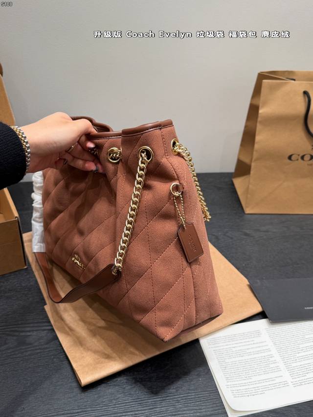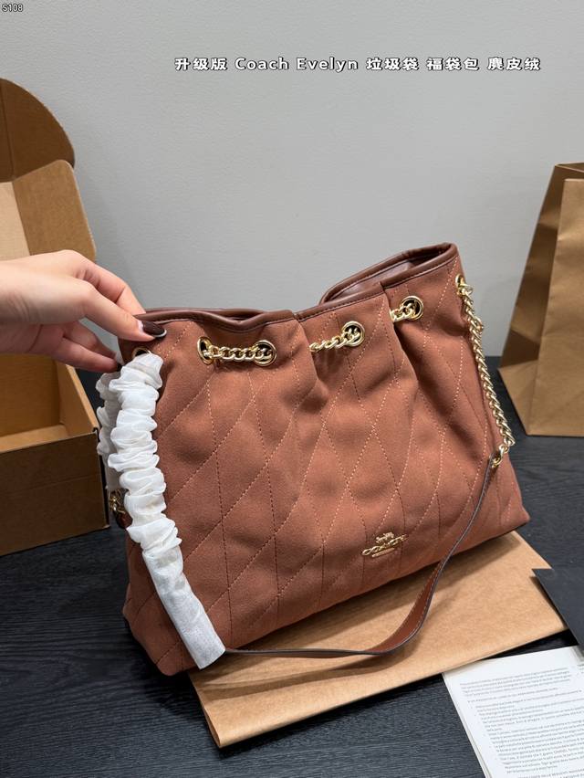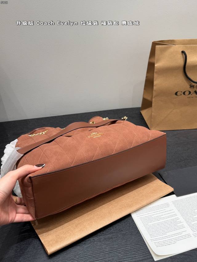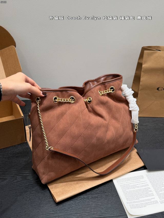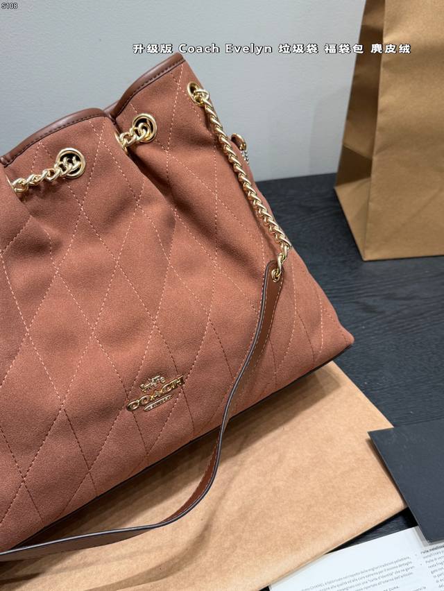 / 礼盒包装 升级版 麂皮 蔻驰Coach Evelyn “垃圾袋”链条福袋包 审美!菱格绗缝设计自带精致Buff,金色链条和褶皱设计甜酷又温柔,日常通勤装个笔记本