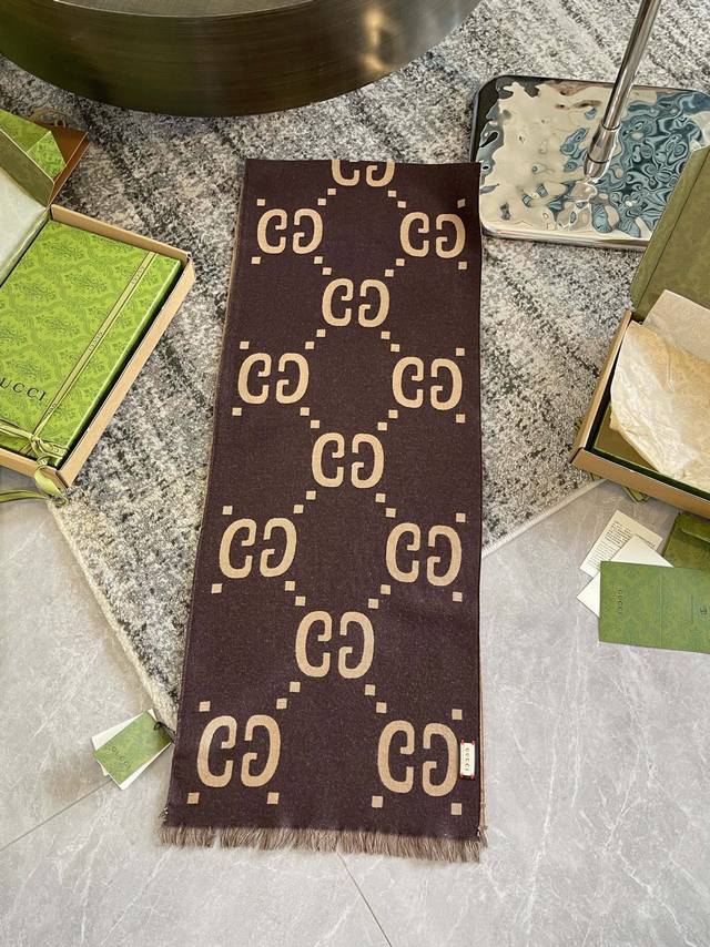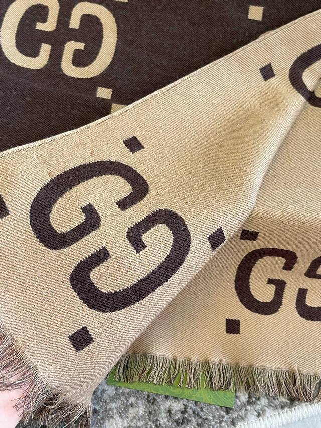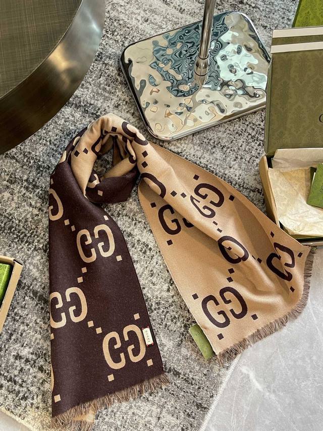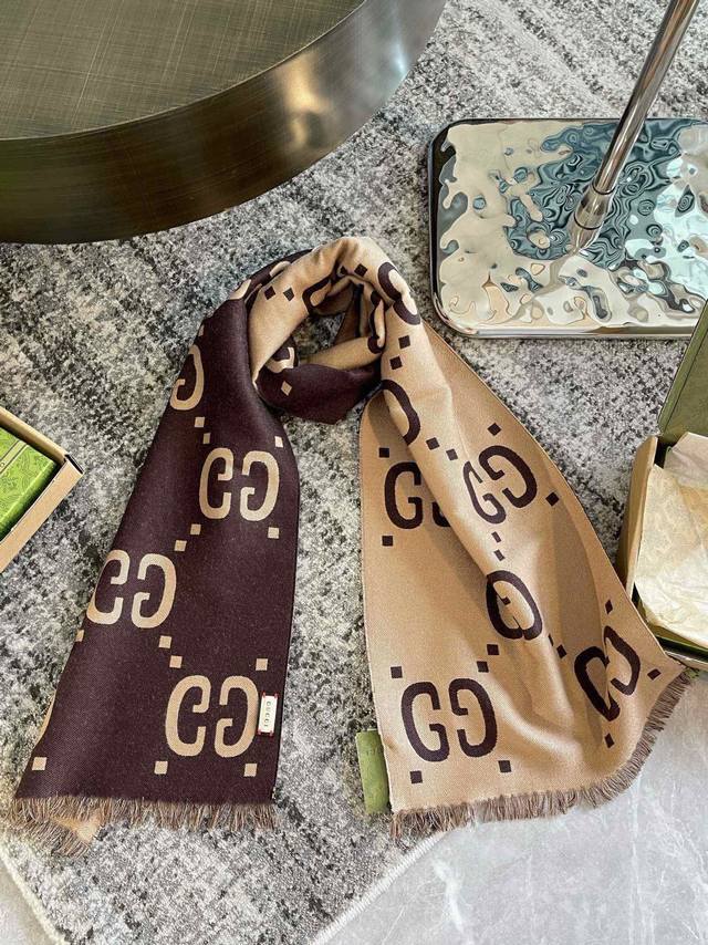 / 专柜礼盒5 双面羊毛围巾 这款柔软的提花羊毛围巾正反两面都饰有gg图案,灵动而又不失俏皮、围巾采用黑色与浅灰色对比色调,典雅的黑灰色流苏令整款设计倍添魅力。材质