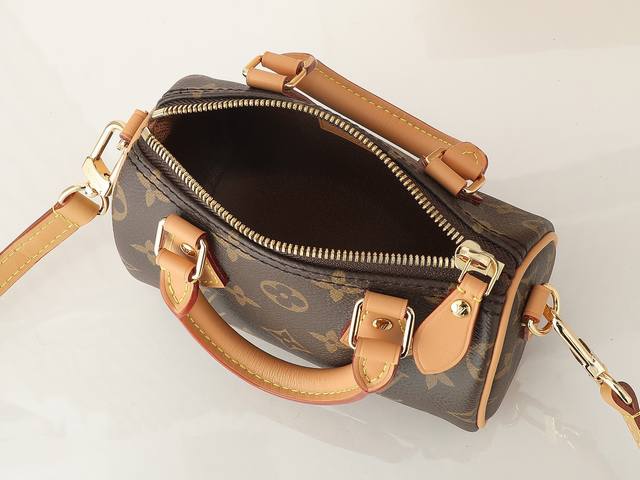 顶级原单、加强版nano Speedy 手袋浓缩路易威登经典 Speedy 手袋构型,以 Monogram 帆布塑造玲珑设计,搭配做旧牛皮革细节和金属件。手柄和