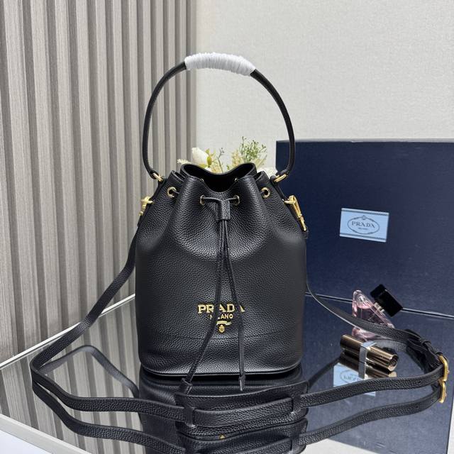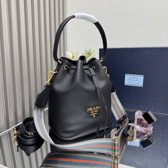 / 顶级原单 最新款荔枝纹水桶包 原单品质小牛皮材质 皮革提手 可拆卸可调节五彩织物肩带 配有皮革肩垫 金属刻字徽标 顶部饰有皮革抽绳 Prada标志衬里 内部有一